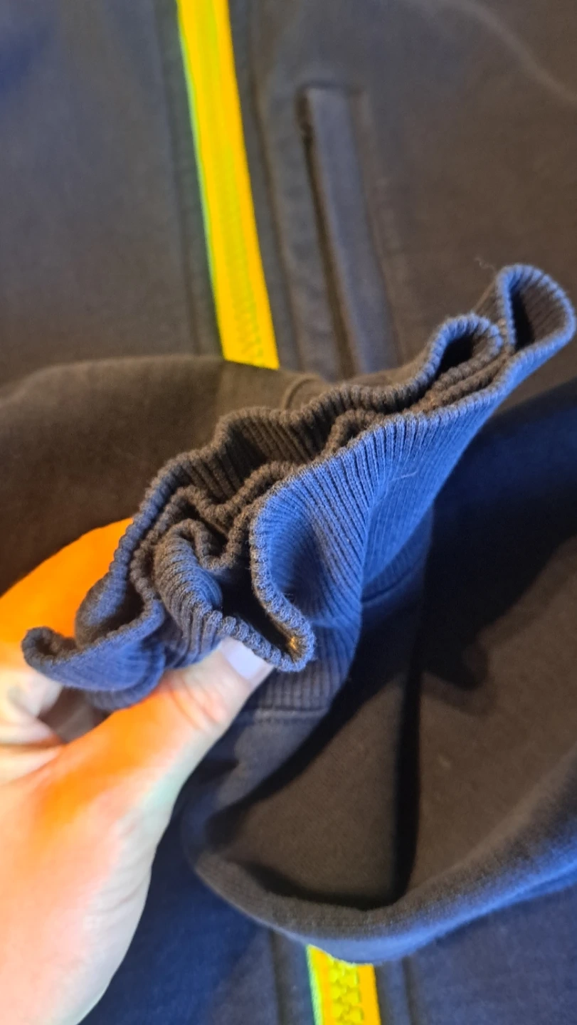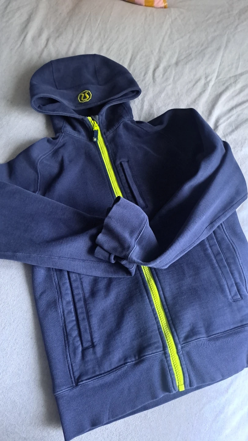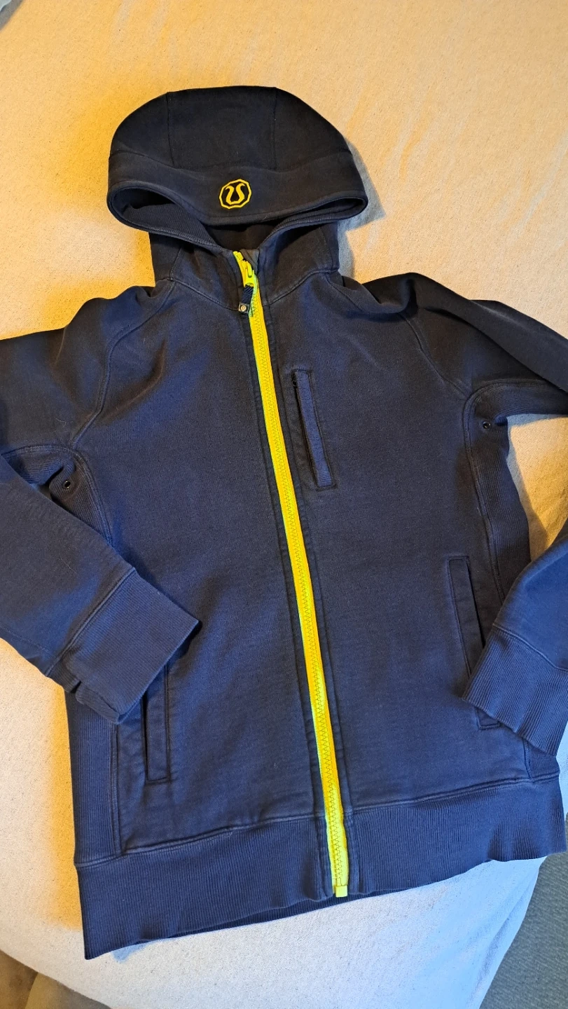 A vintage Lululemon full zip hoodie in navy. It's made with a soft fabric and features a bright yellow zipper. This hoodie has a comfortable slim, size small fit and includes pockets.