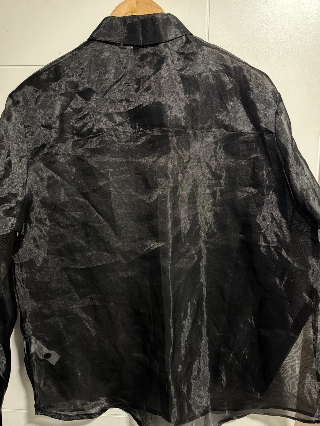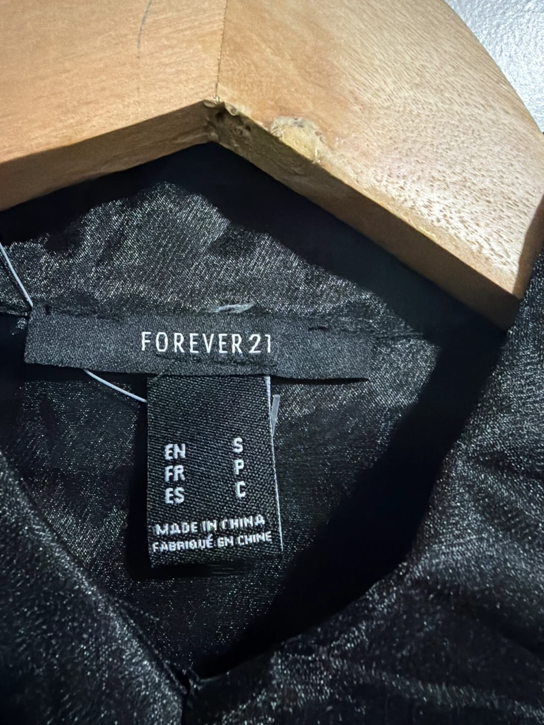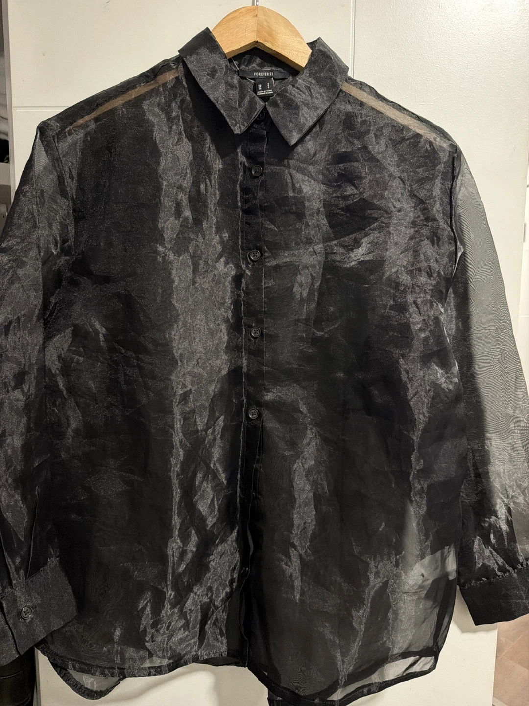 This is a black sheer button-up shirt from Forever 21. It's a size small and made of a delicate, sheer fabric. It comes with a collared neckline and button closure down the front.