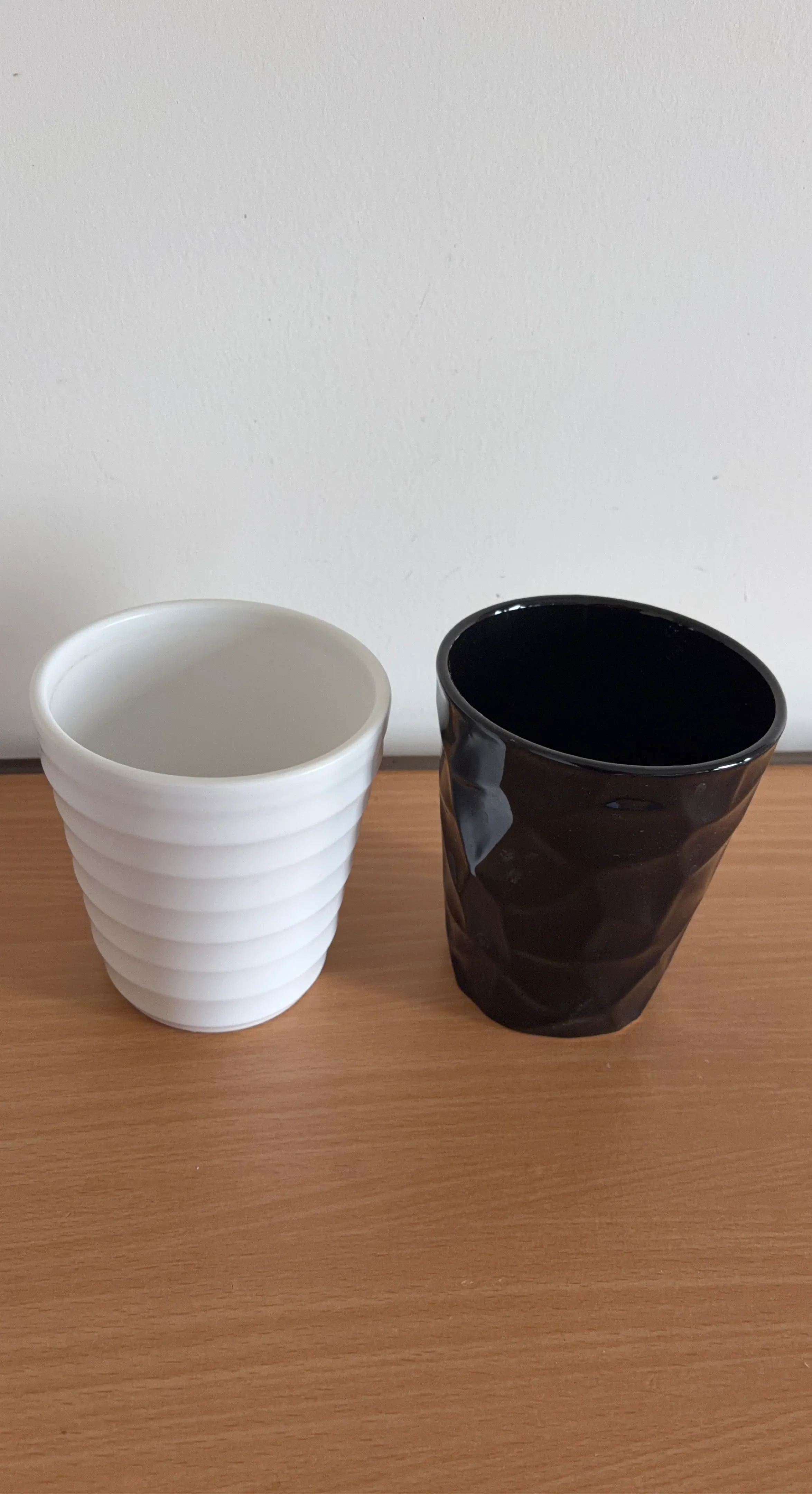 Two lovely decorative planters, one white and one black. They're made of a durable material with a textured finish. Perfect for adding a touch of style to your home decor or for your favourite small plants!