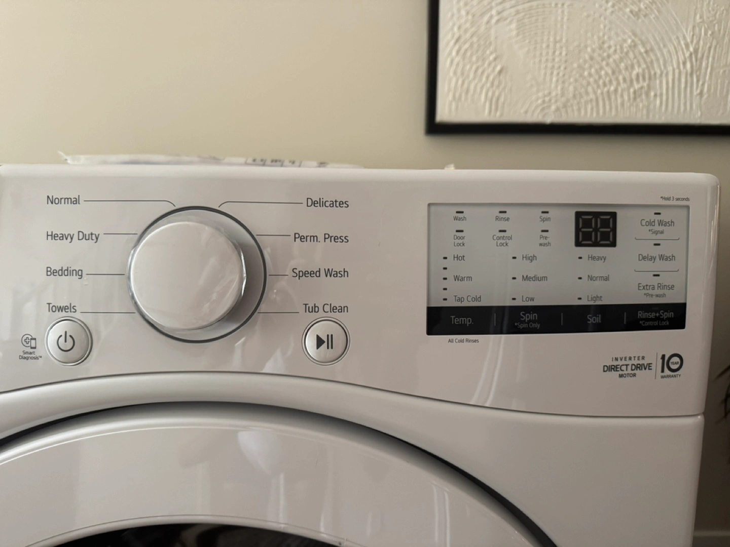 Selling an LG front load washing machine. It's in great shape and ready for a new home. Features include multiple wash cycles like Normal, Heavy Duty, and Bedding, as well as options for different temperatures and spin speeds. It also has a Tub Clean cycle to keep it fresh.