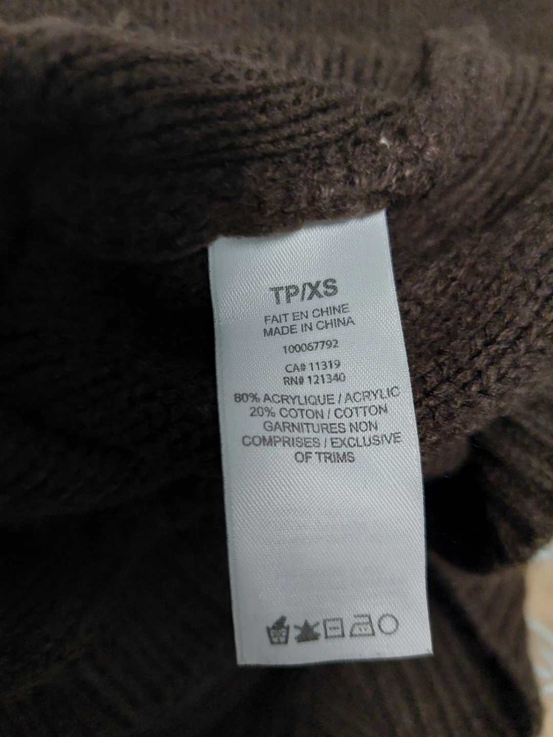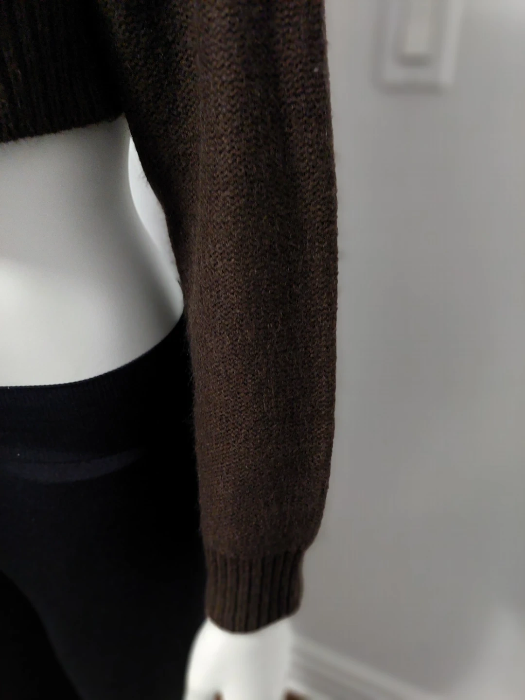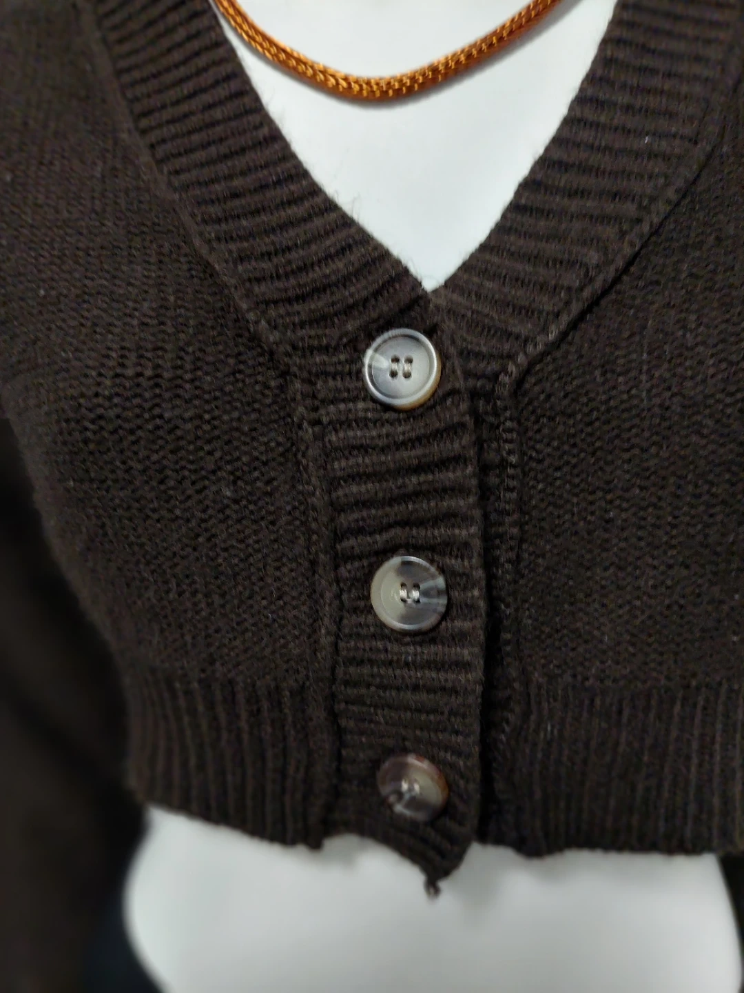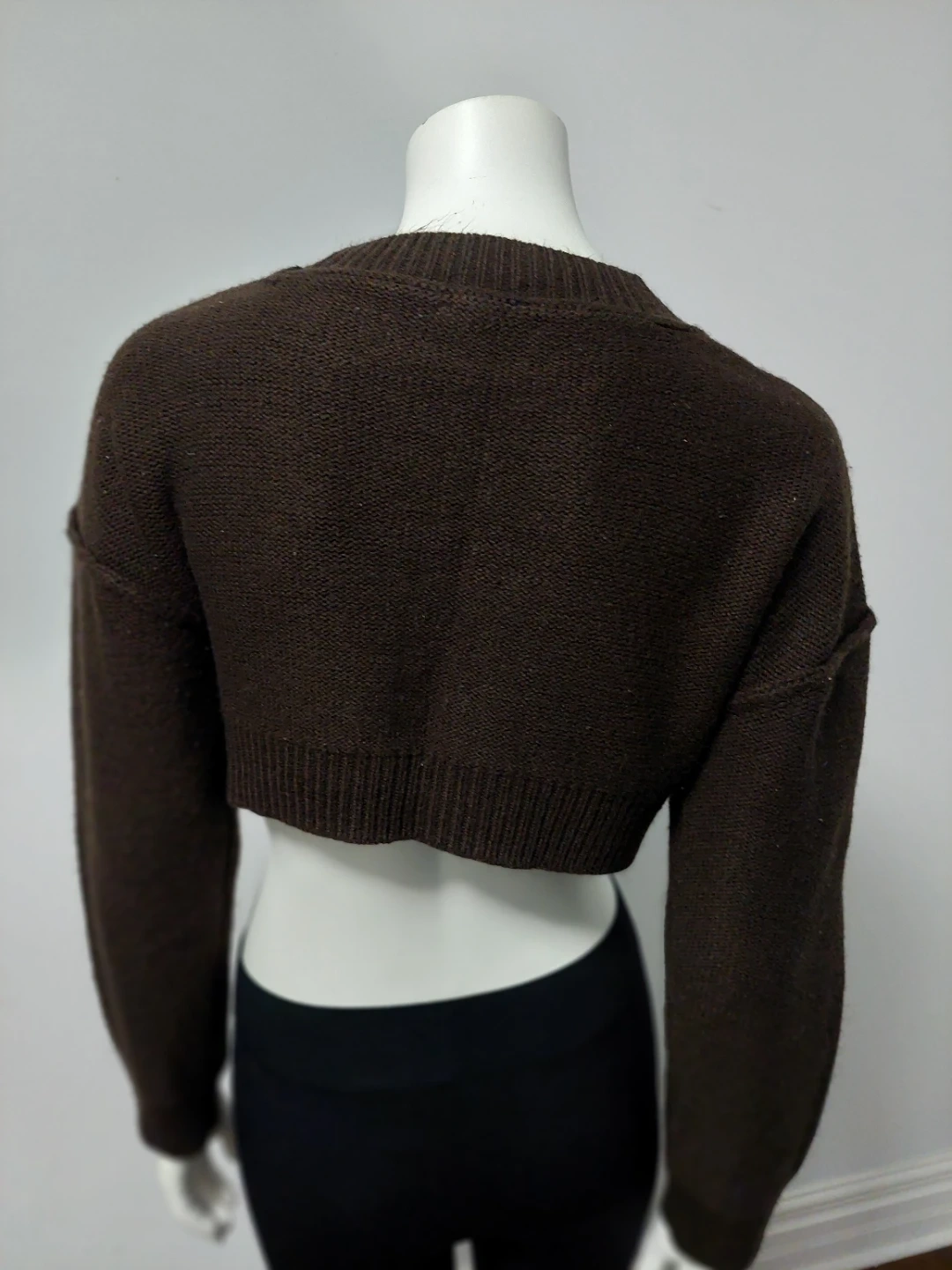 A brown cropped cardigan made from 80% acrylic and 20% cotton. It features a button-up front and a V-neckline. Size TP/XS.