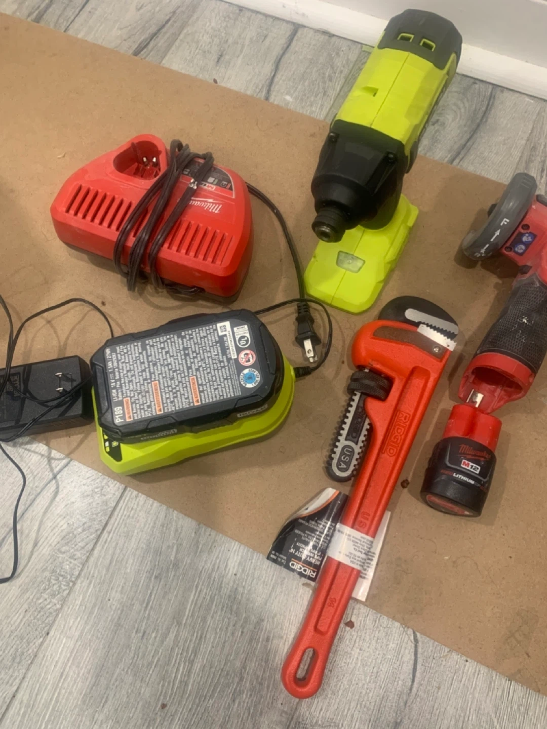 Set of four Volkswagen alloy wheels with tires. These are good for winter driving. Comes with a Ridgid pipe wrench and Milwaukee power tools.