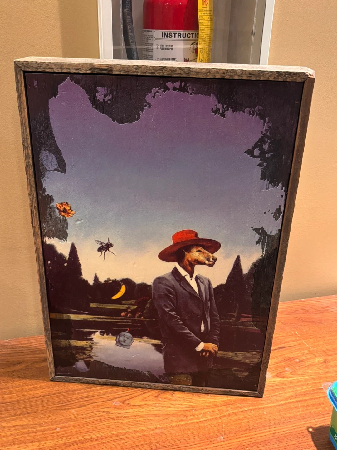 Framed artwork featuring a surreal scene with a dog character in a hat and suit. The print has a unique, dreamlike aesthetic. Wood frame included.
