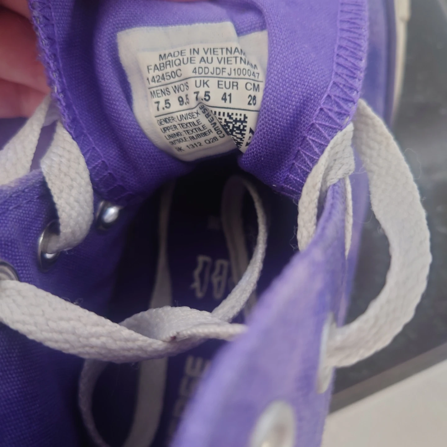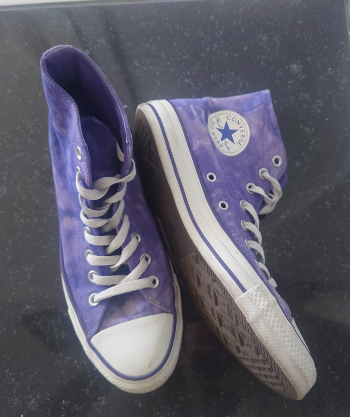 These Converse Chuck Taylor All Star high tops feature a cool purple tie-dye pattern. Canvas upper with lace-up closure. Rubber sole.