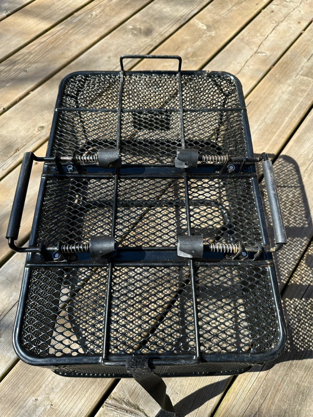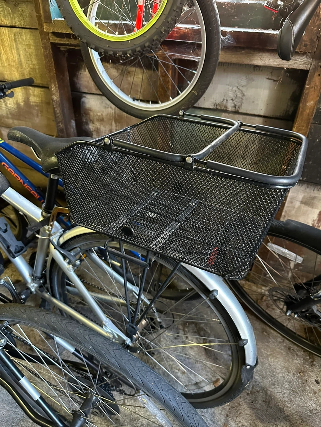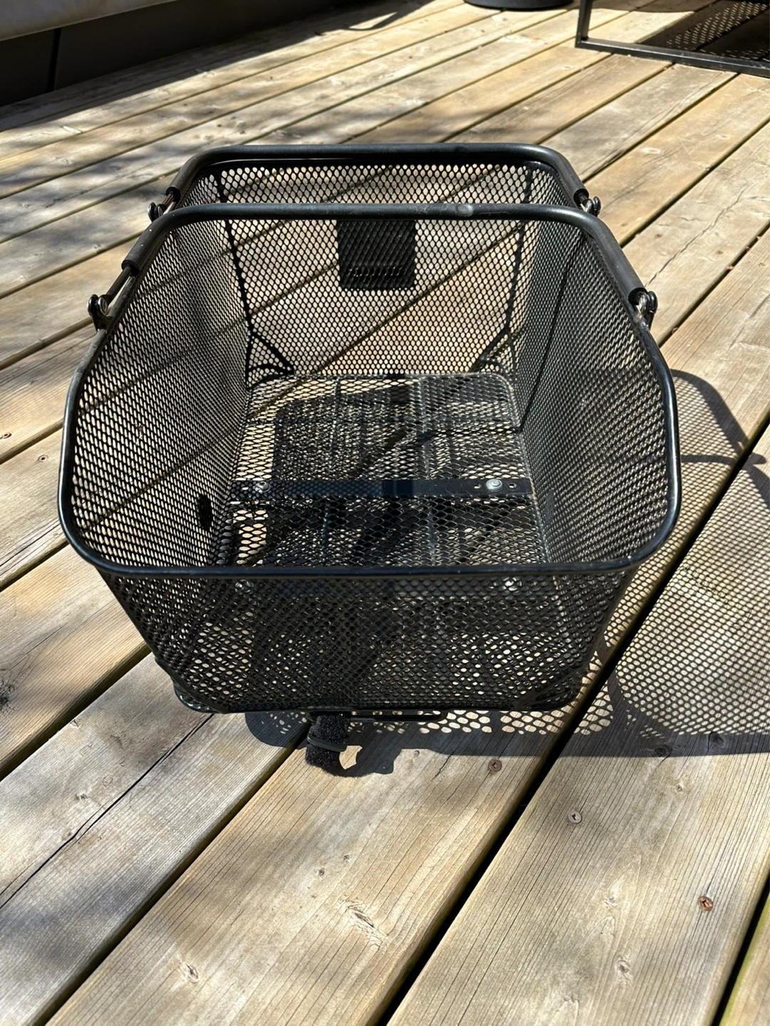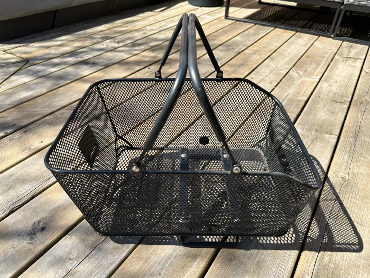 This black metal basket is a handy accessory for your bicycle. It's designed for easy attachment and has sturdy construction. Perfect for carrying groceries or other items while you ride!