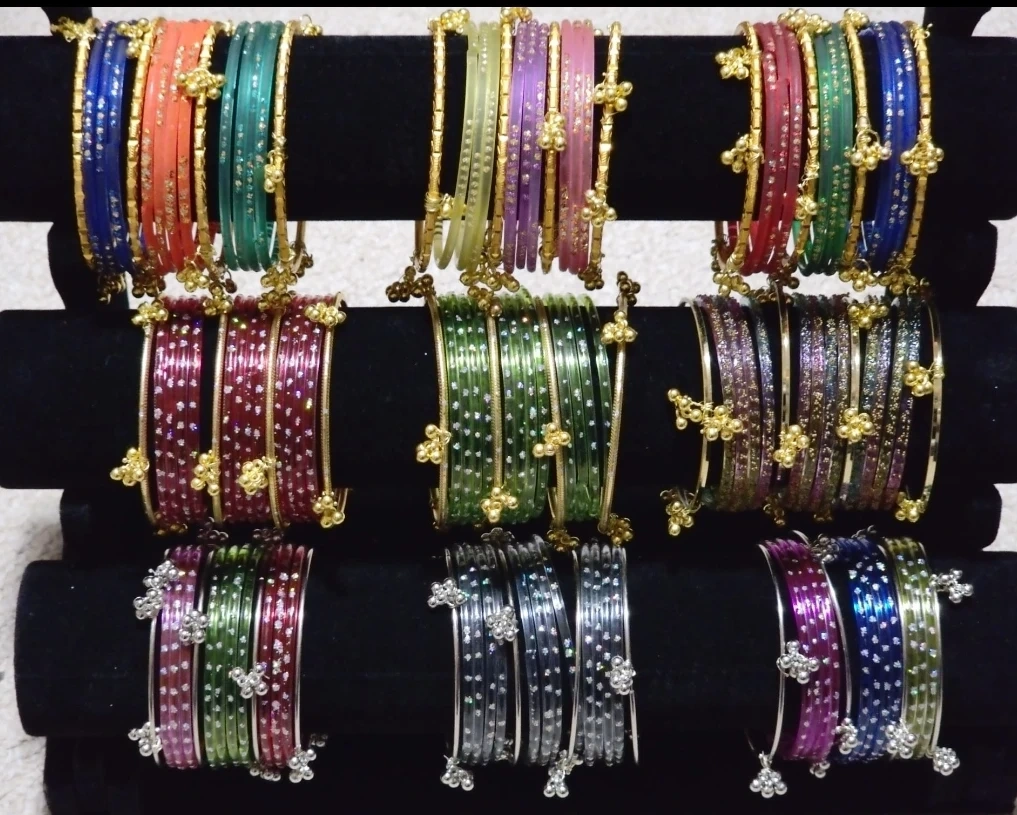 A colourful collection of glass bangles, accented with delicate gold-tone embellishments and tiny bells. Various vibrant colours available. These bangles are ideal for adding a festive touch to any outfit.