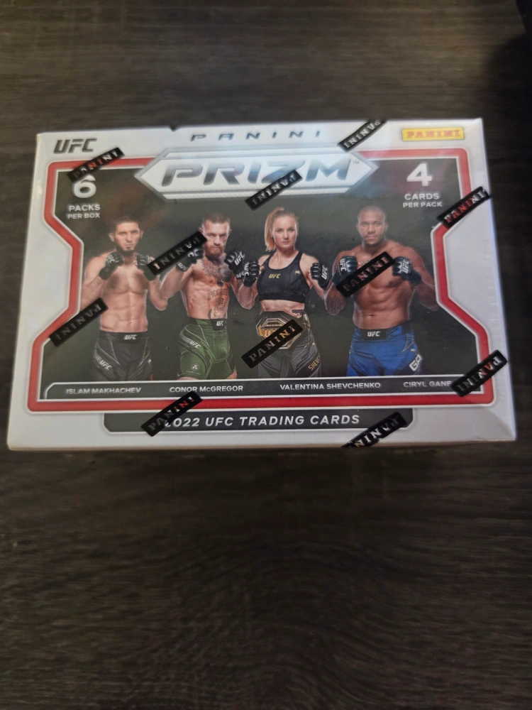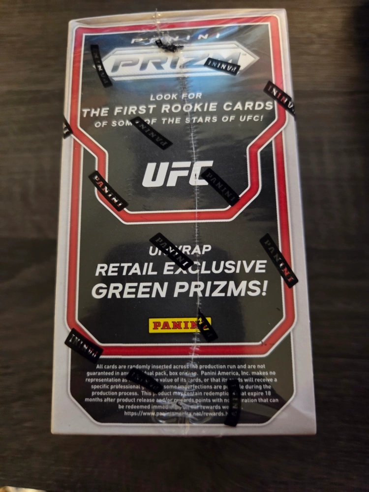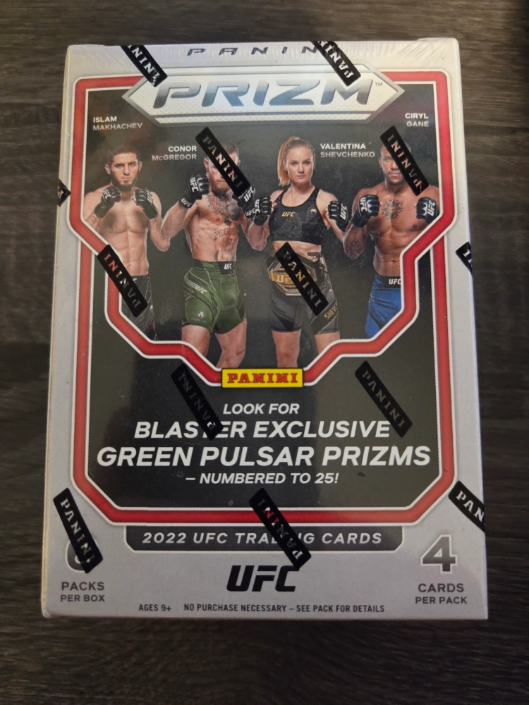 Brand new still sealed 2022 UFC Prizm blaster box. It contains 6 packs per box, with 4 cards per pack. Look for blaster exclusive Green Pulsar Prizms, numbered to 25!