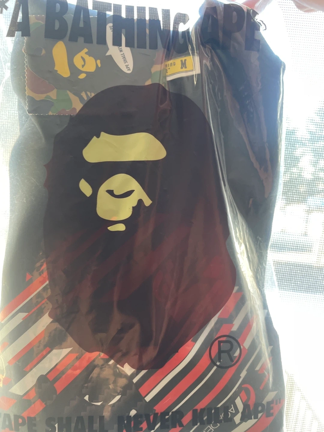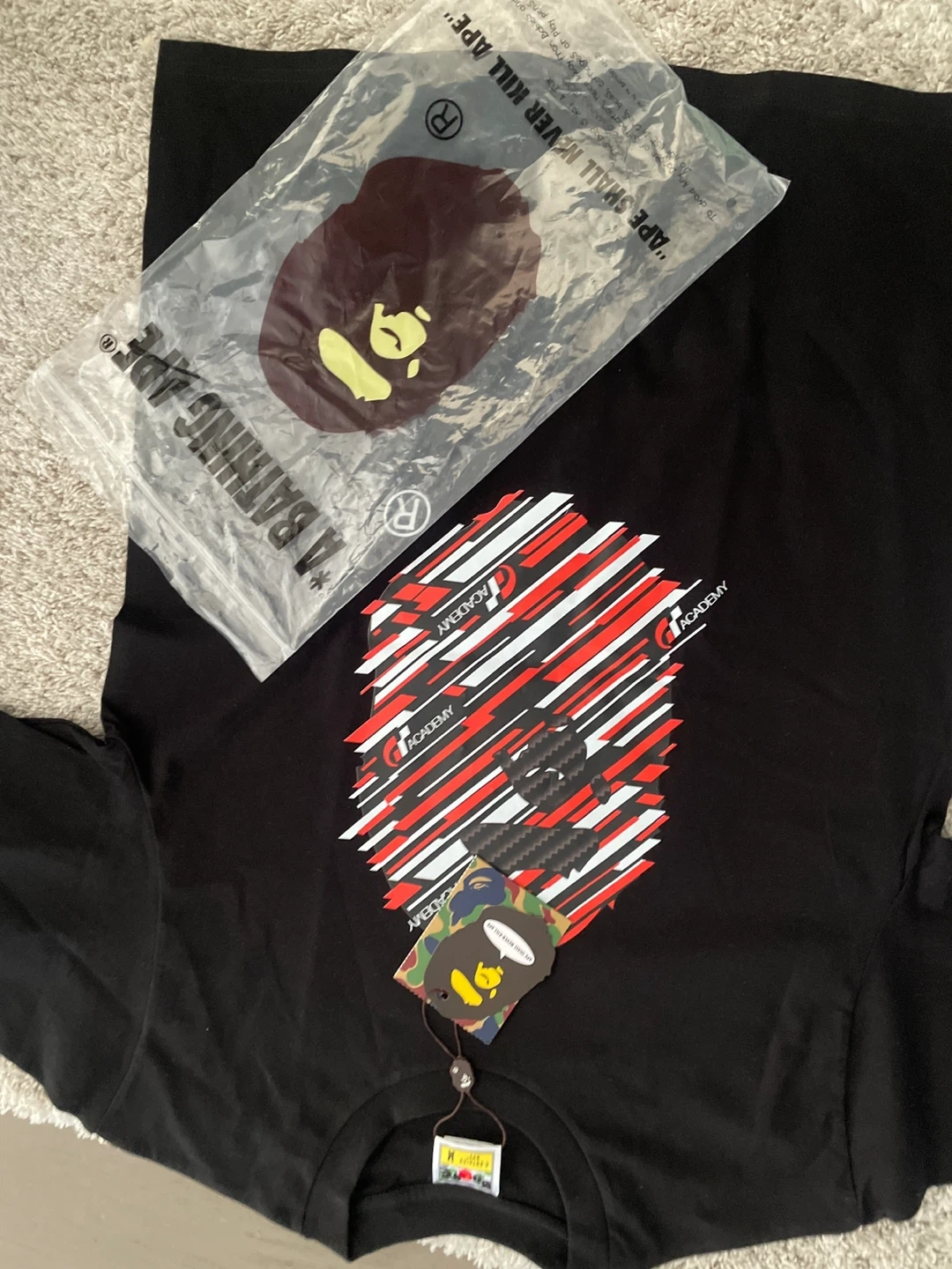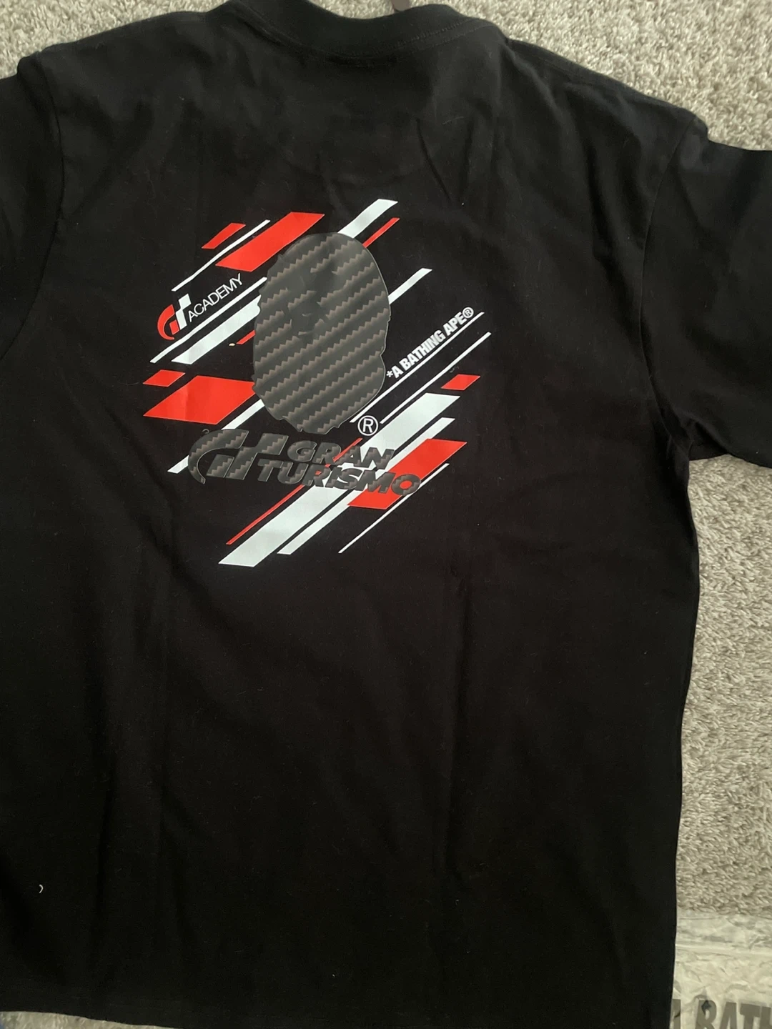 Black A Bathing Ape t-shirt featuring the "Gran Turismo" graphic. It's a size medium and comes with its original packaging.