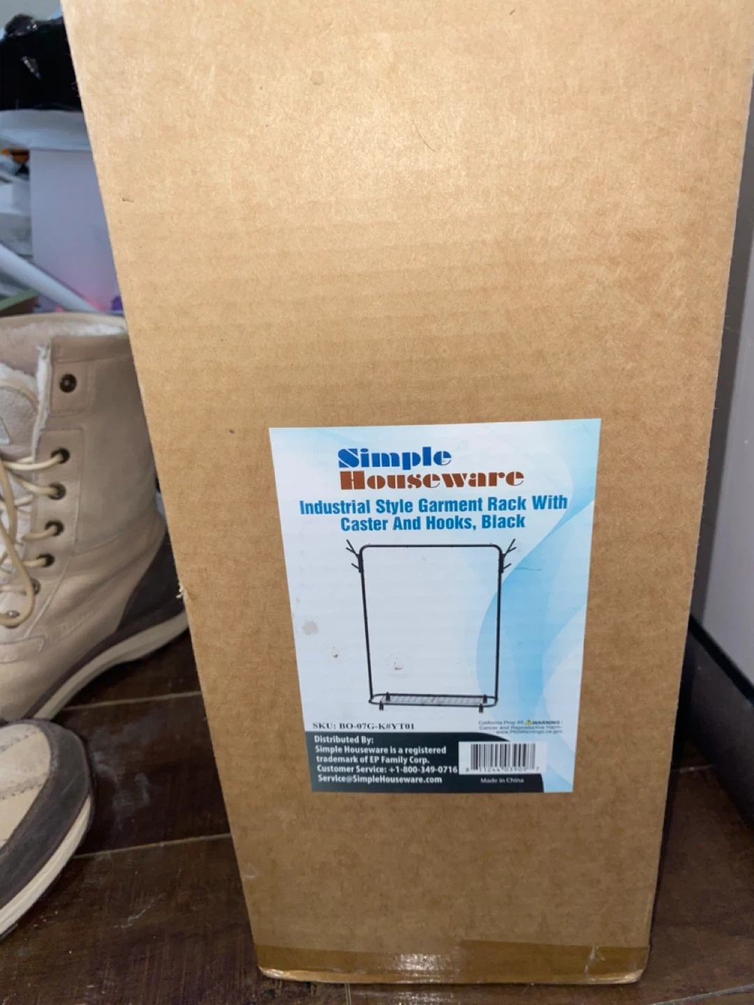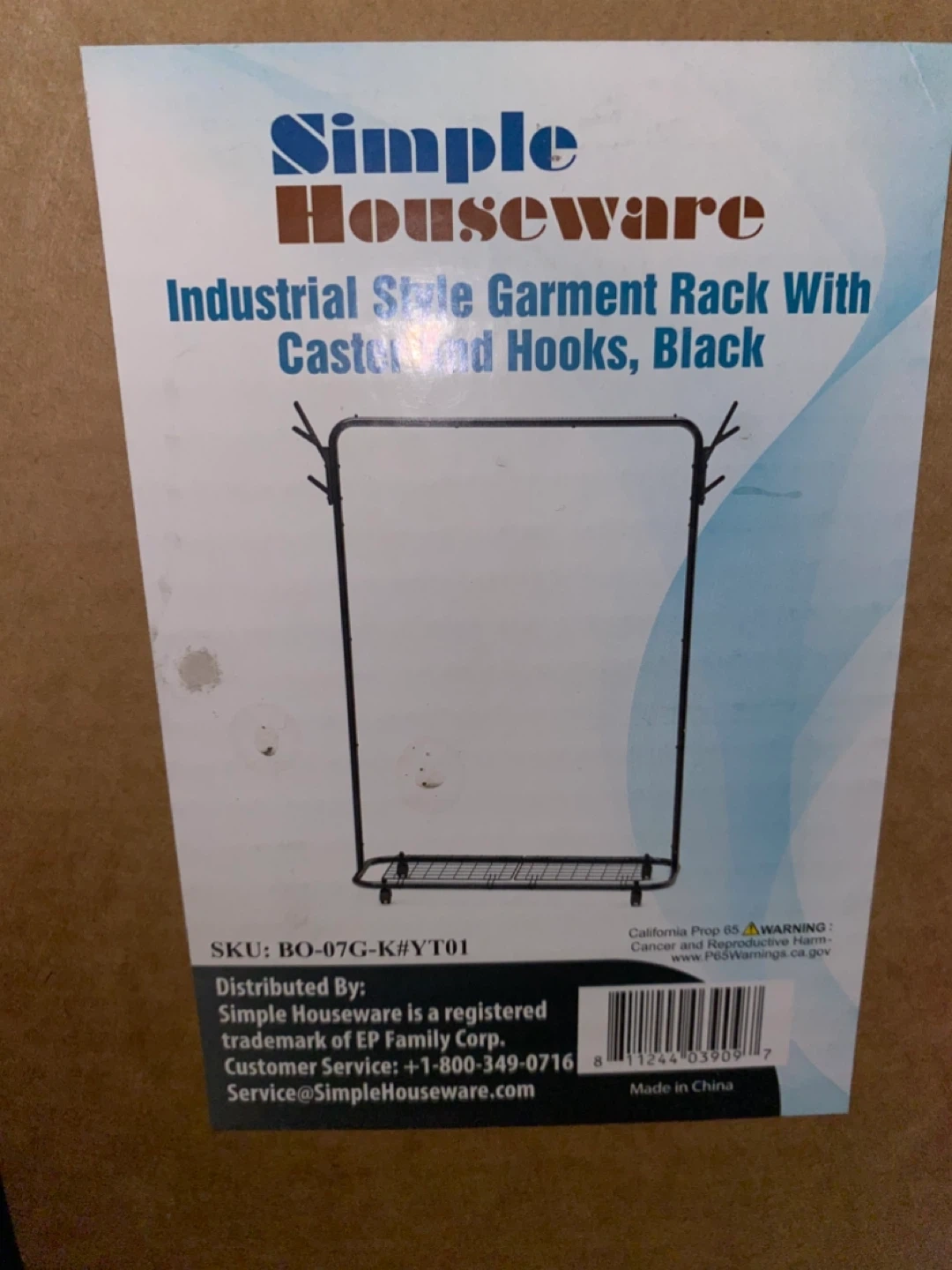 This is a Simple Houseware industrial style garment rack. It's black and includes casters, shoe rack, and hooks for easy movement and hanging. This rack is great for organizing clothes in your closet or room. Never used or even opened, still in box waiting assembly!
