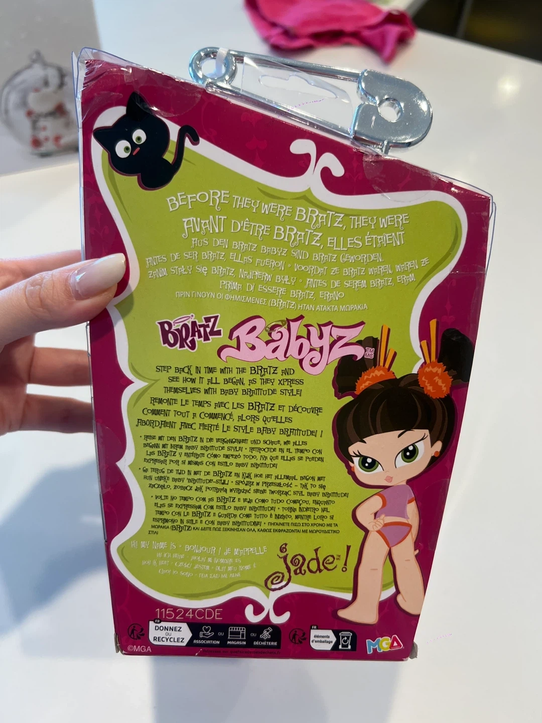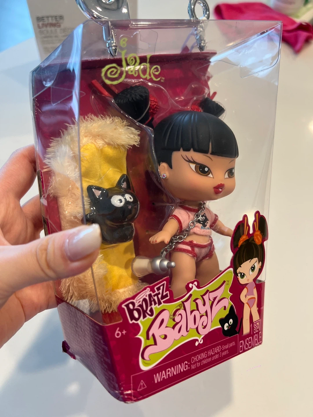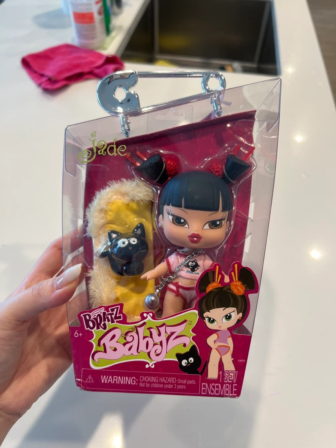 Bratz Babyz doll featuring Jade. Includes a fluffy yellow outfit and a black cat accessory. Recommended for ages 6 and up. This doll comes in its original packaging.
