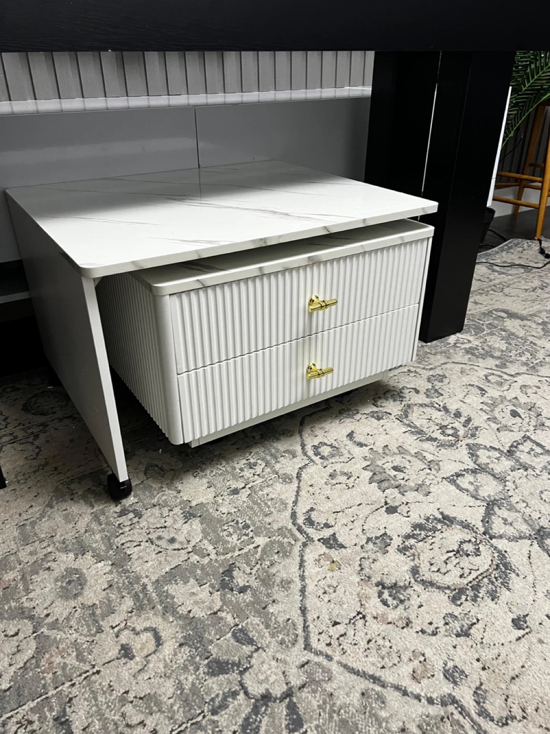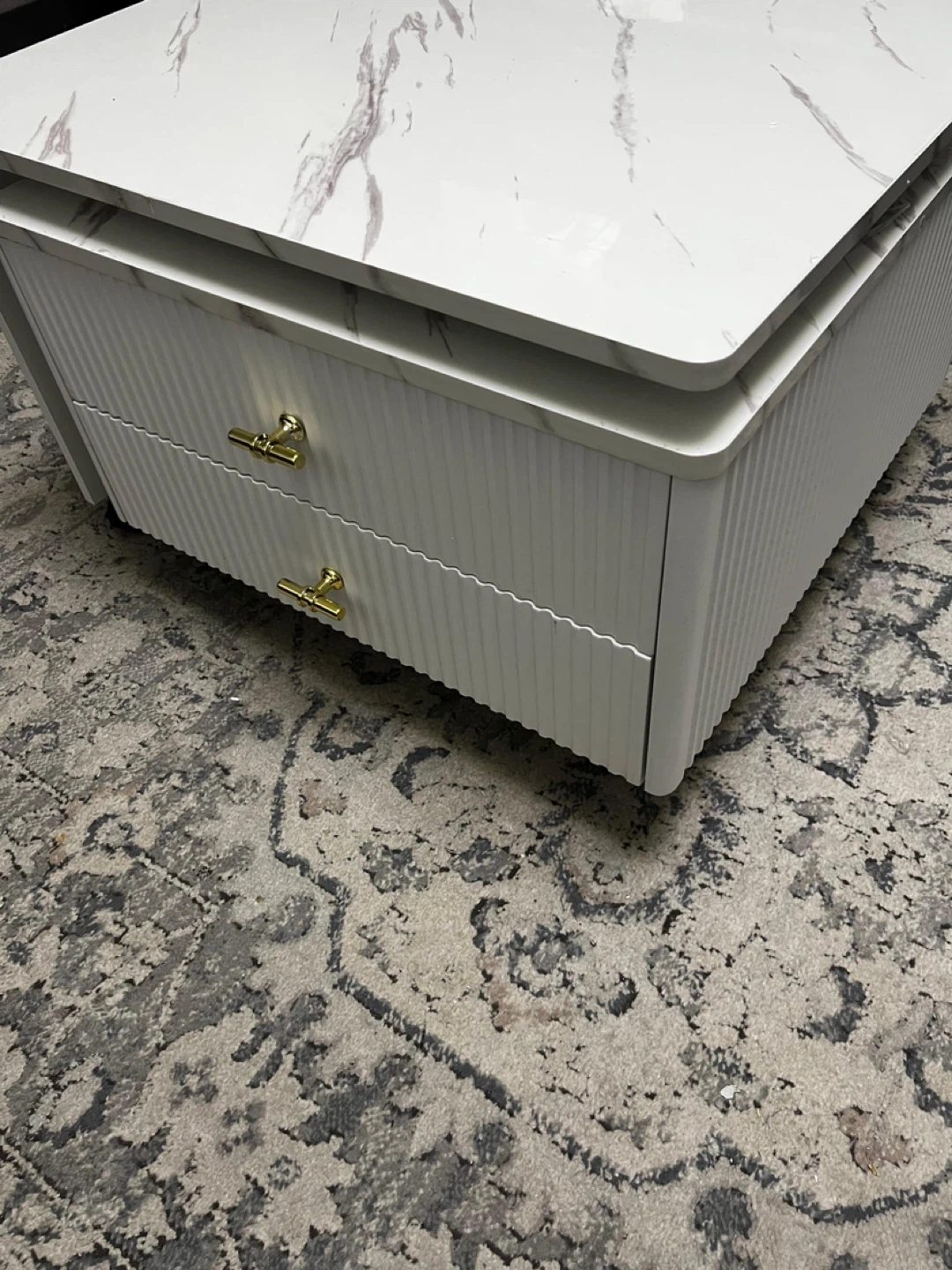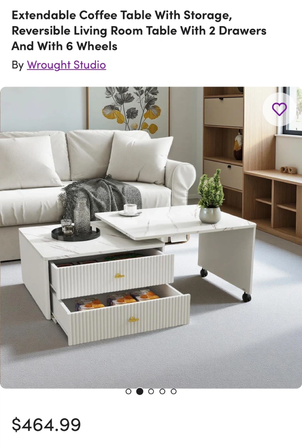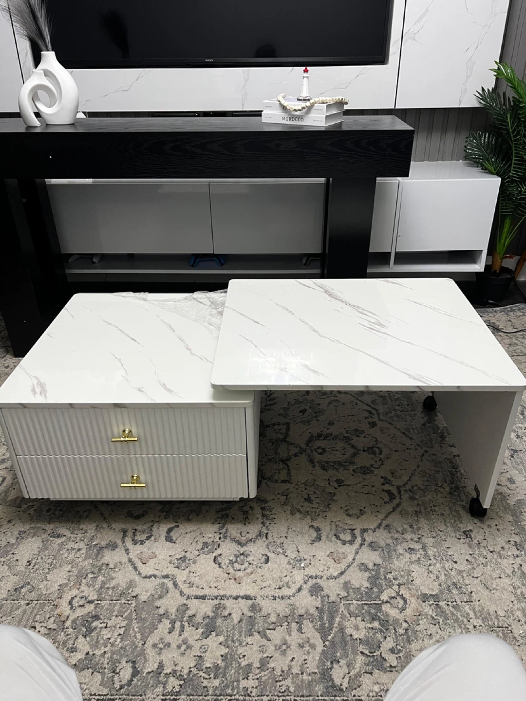 This extendable coffee table offers convenient storage with two drawers. It's made with a white marble-look finish and gold hardware. The table features wheels for easy mobility.