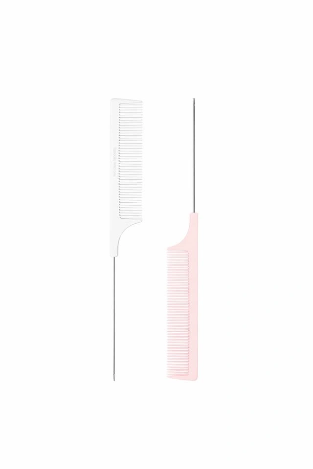 This is a professional set of two Brushworks tail combs, designed for precise hair parting, sectioning, and styling. Each comb features a fine-toothed body and a pointed needle handle. They are lightweight and durable.