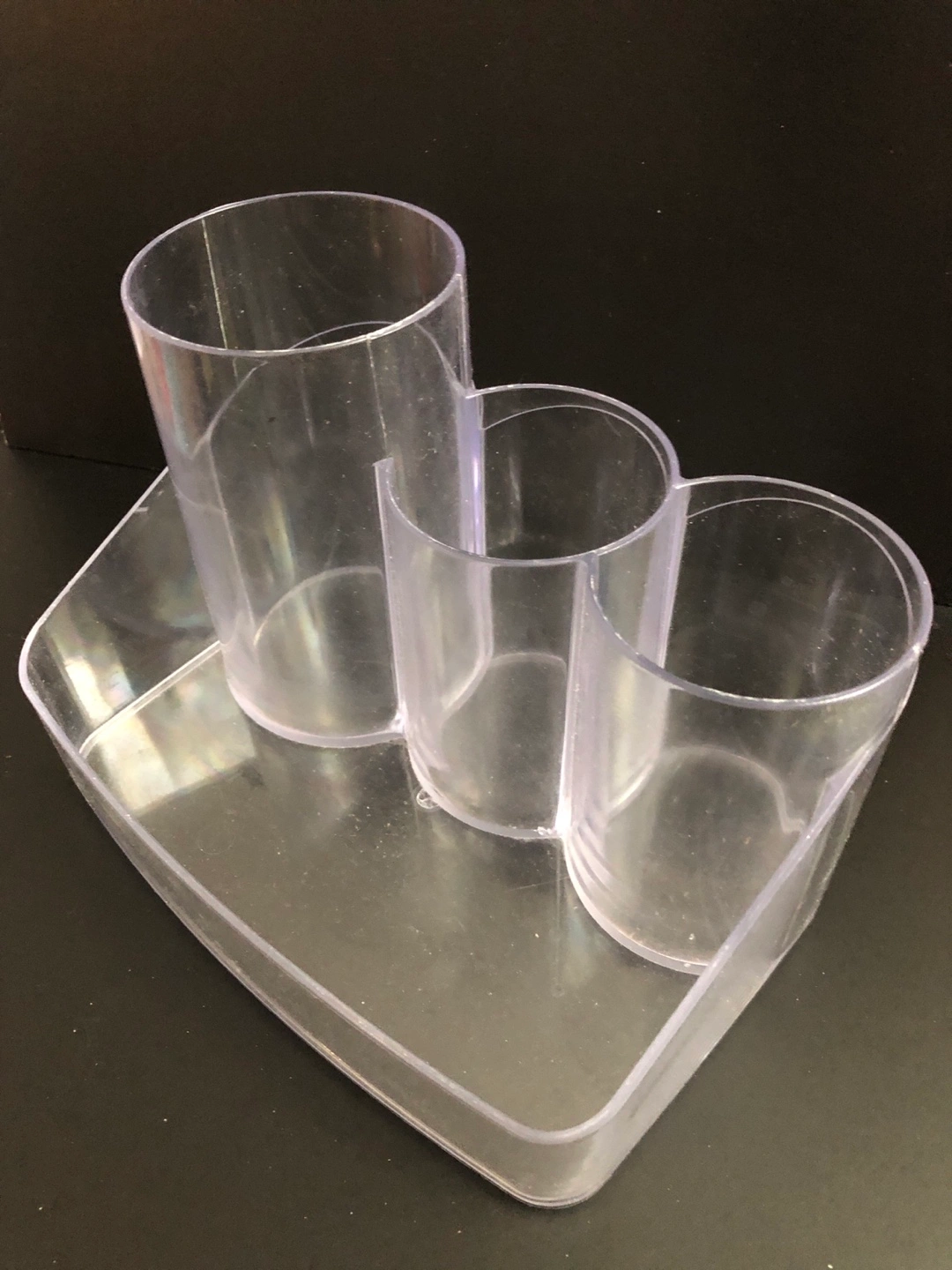 Clear plastic desk organizer with three compartments. Great for organizing pens, pencils, or other desk accessories.