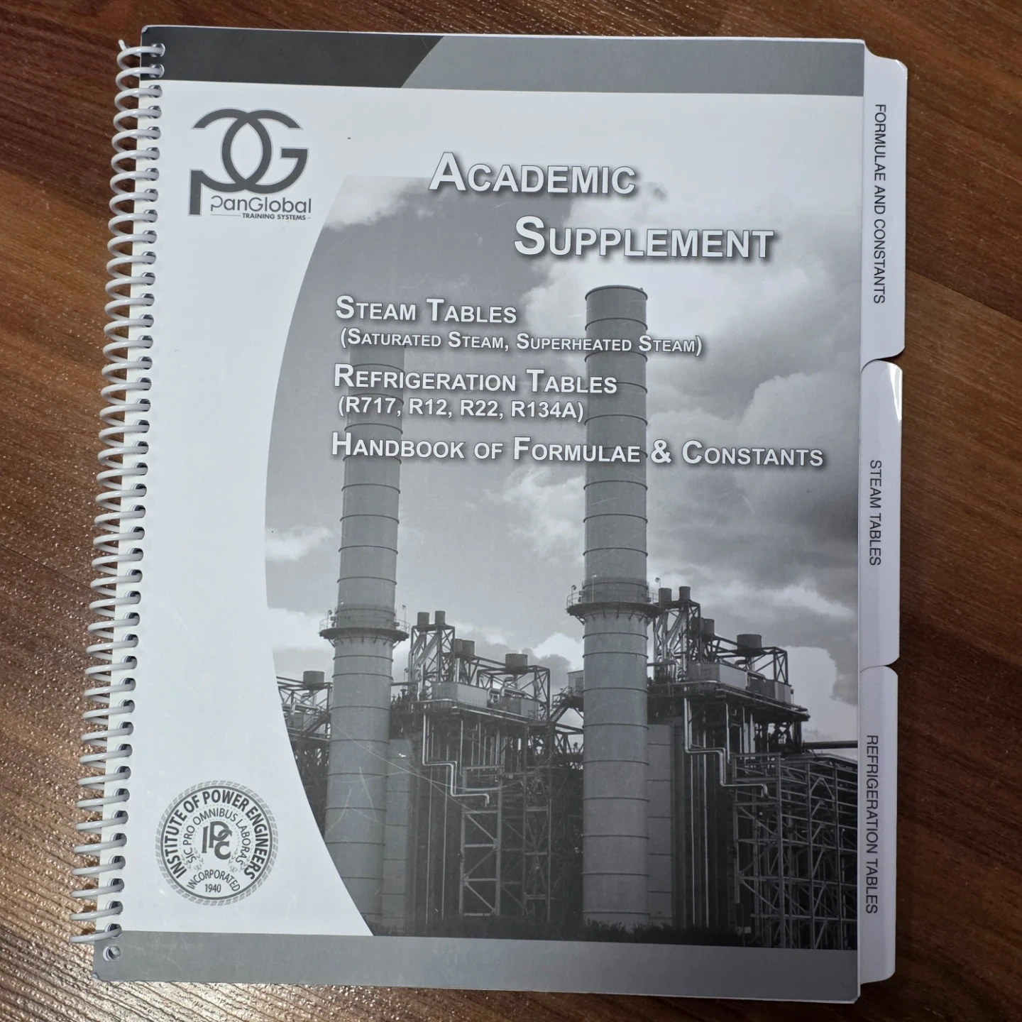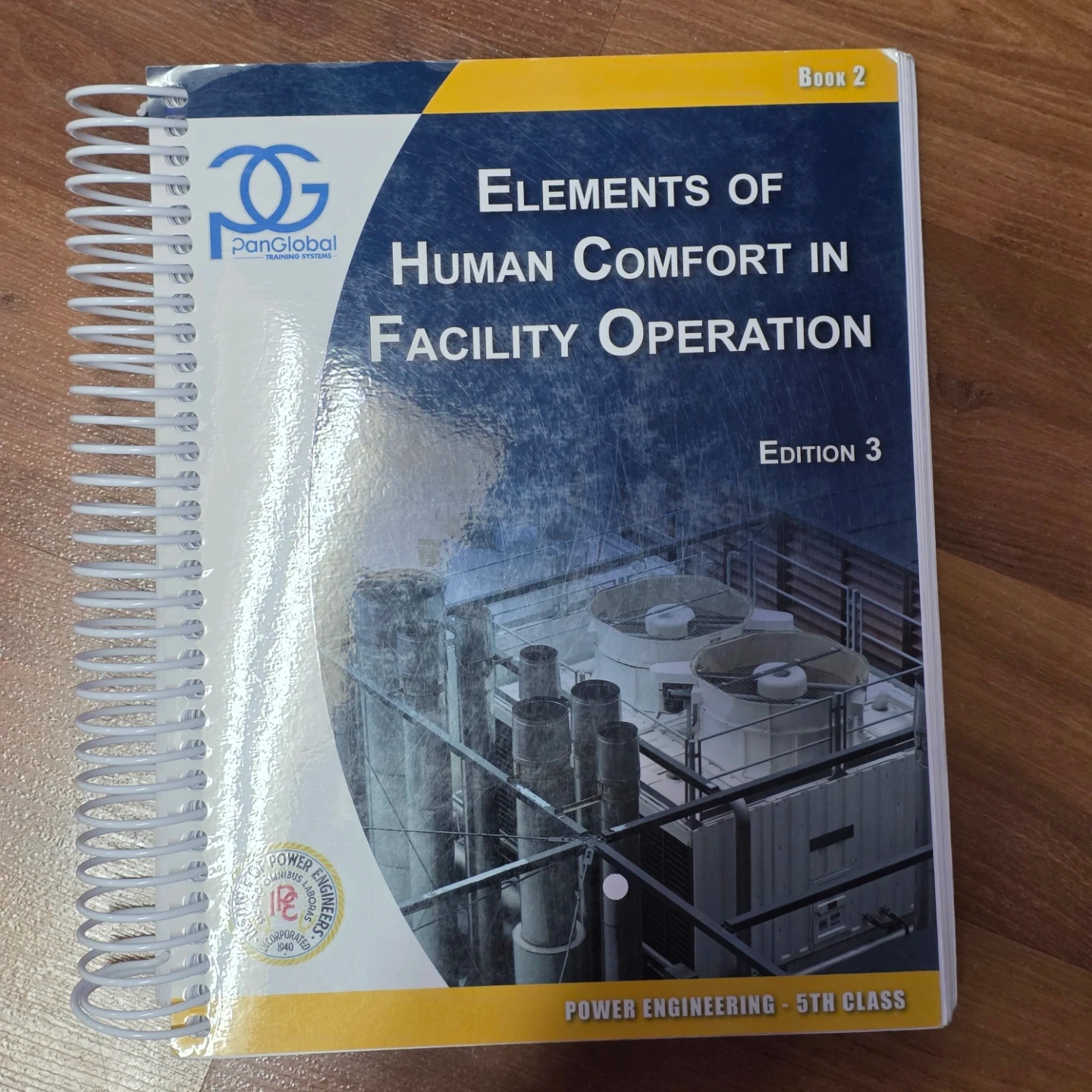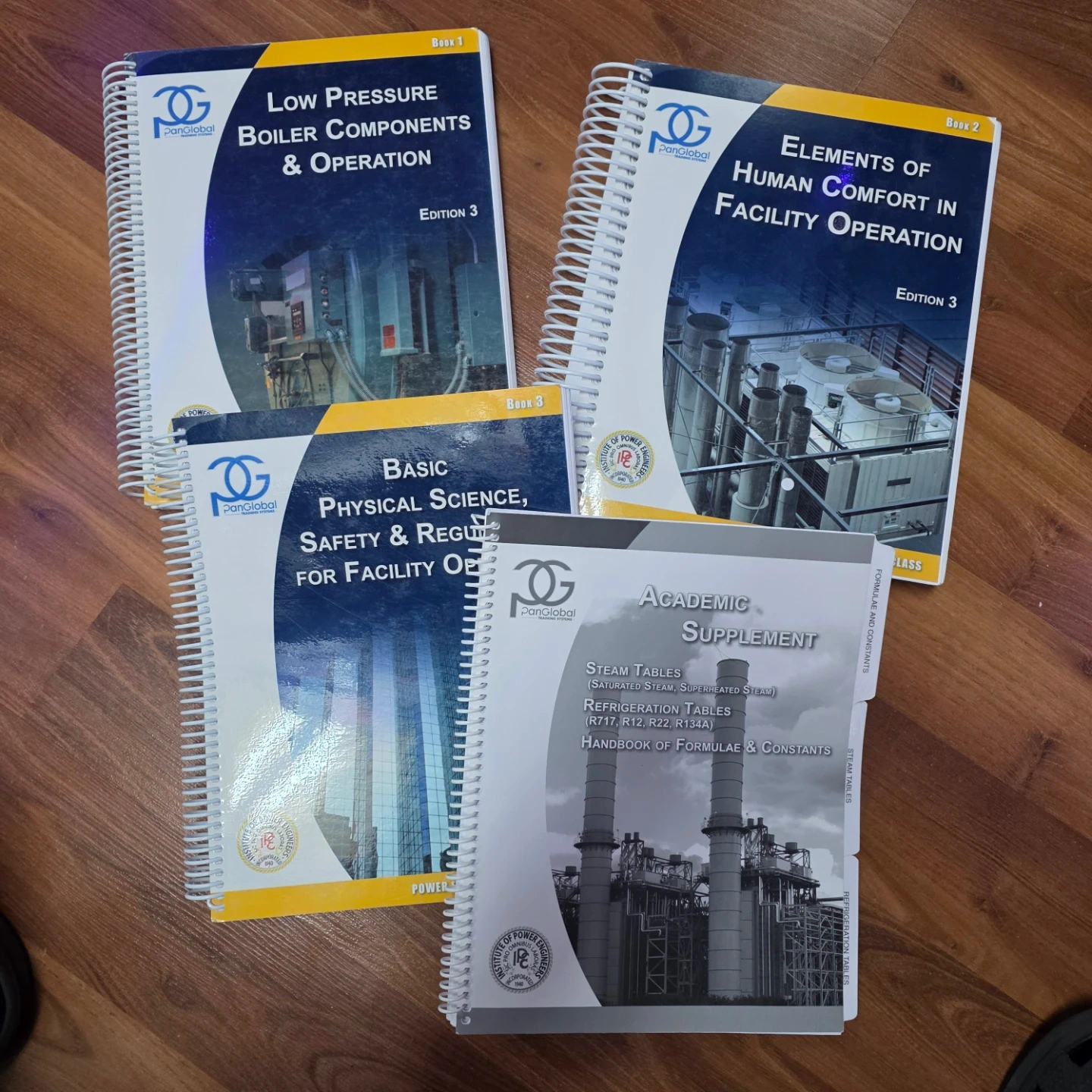 Set of four training books from PanGlobal for Facility Operation and Power Engineering. Includes 'Low Pressure Boiler Components & Operation', 'Elements of Human Comfort', 'Basic Physical Science, Safety & Regulation', and an 'Academic Supplement' with Steam Tables and Refrigeration Tables.