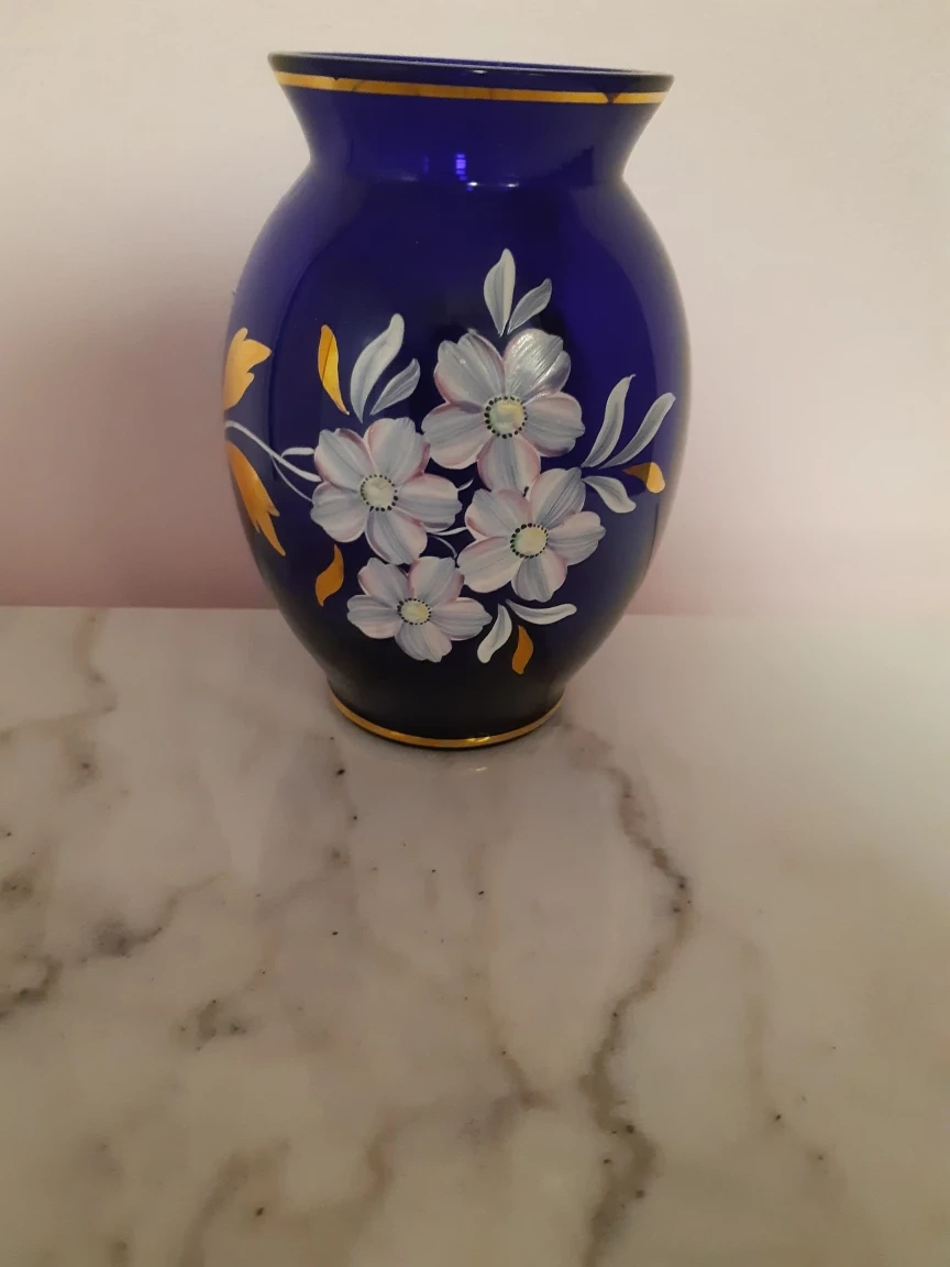 Hand-Painted Cobalt Blue Glass Vase with Floral Design