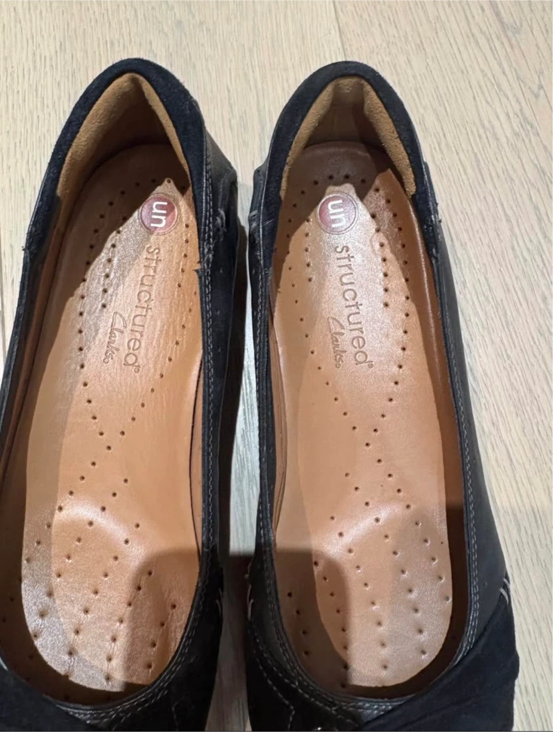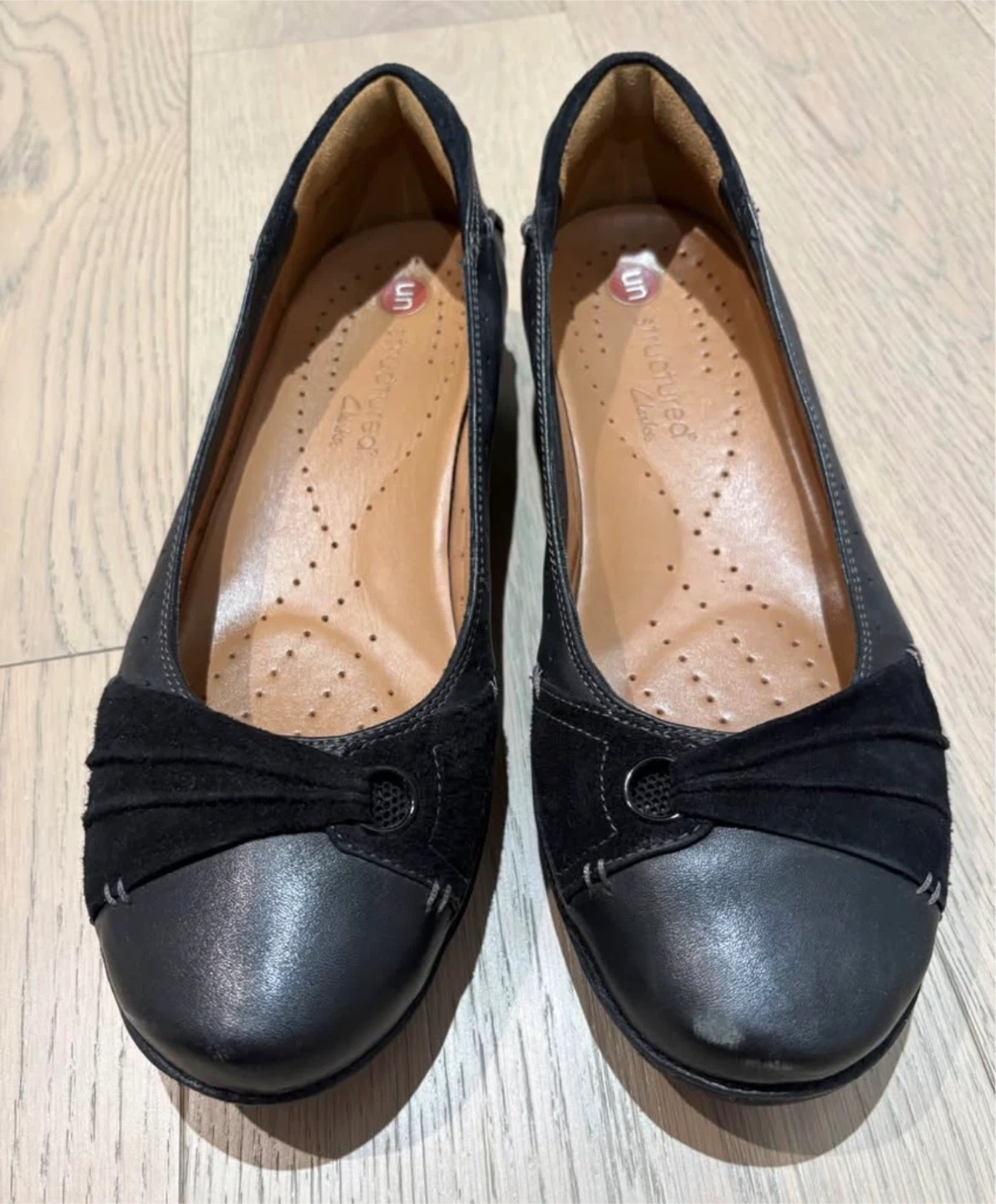 These are a pair of Clarks Unstructured black leather flats. They feature a stylish design with a suede accent. Perfect for everyday wear! There are scuff marks on shoe as shown in photos.