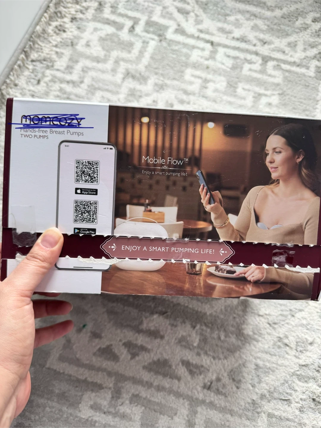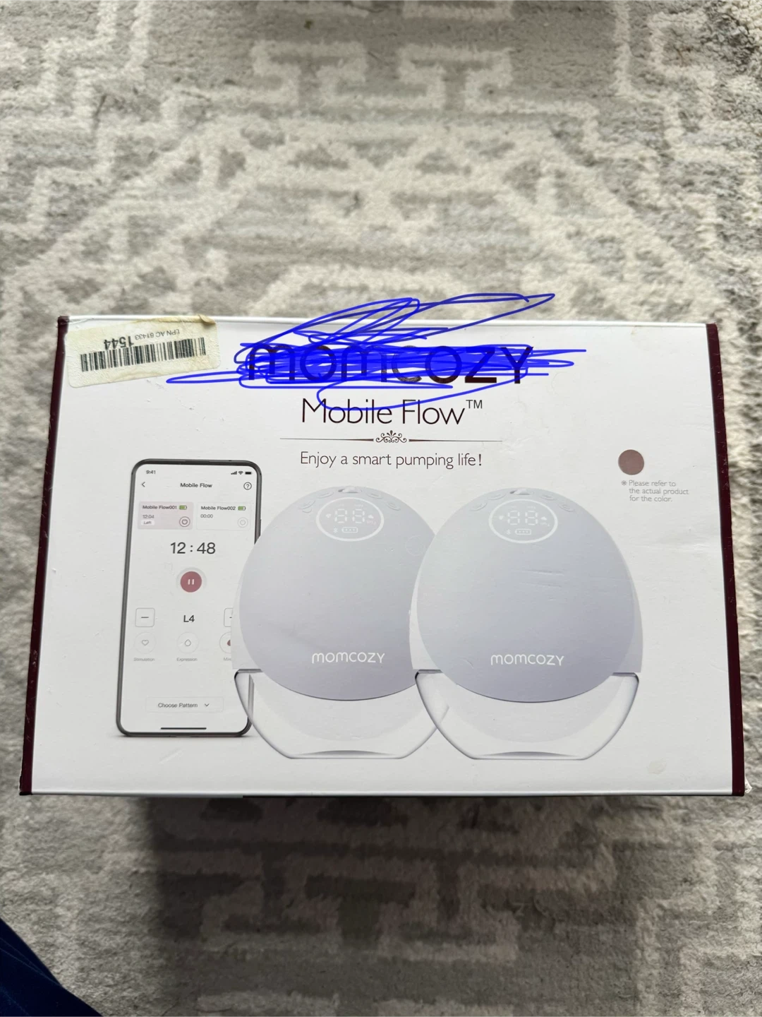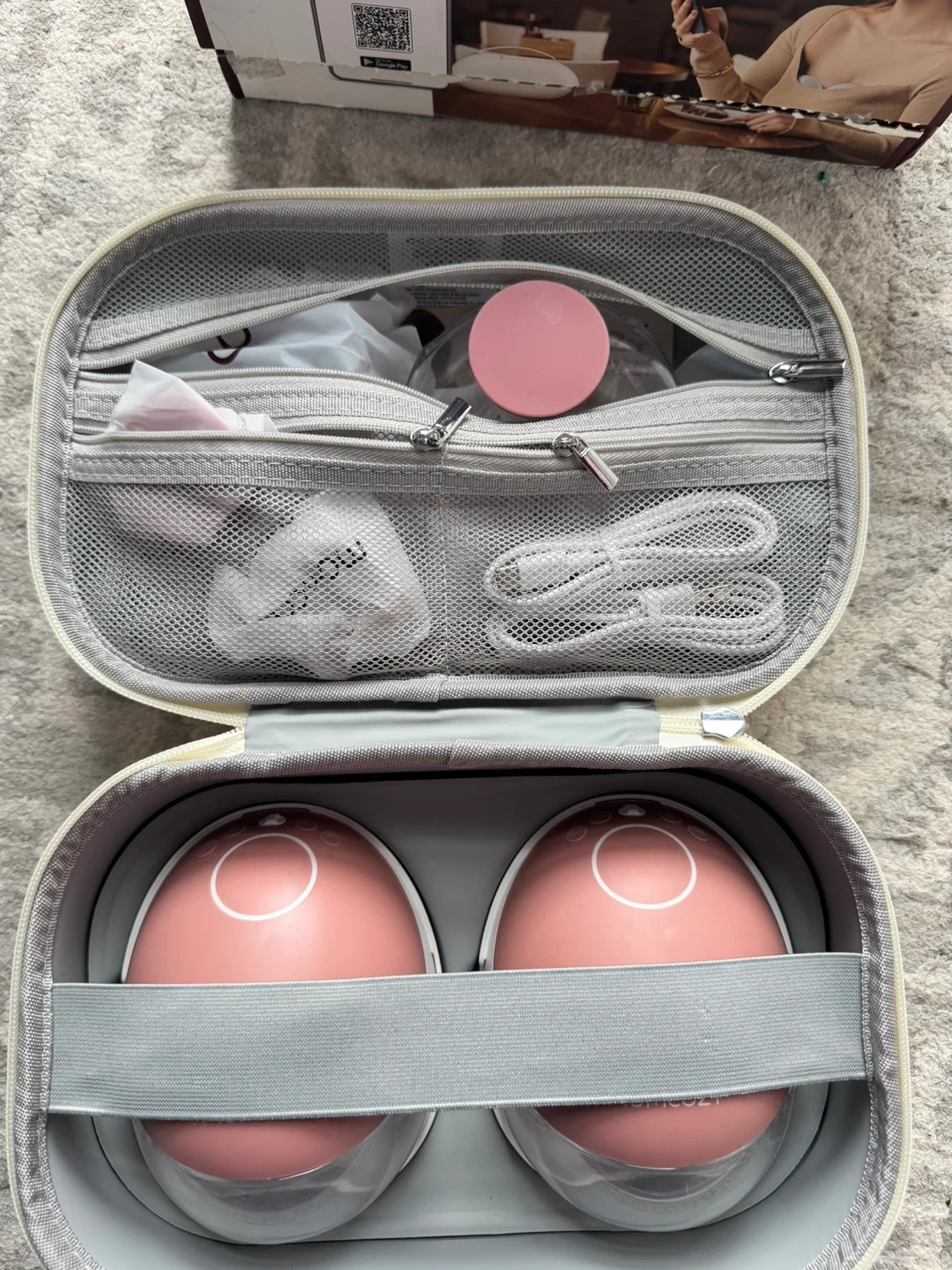 Momcozy wearable breast pump, Model Mobile Flow, in pink. Includes two pumps, charging cables, and a carrying case. Offers multiple flange insert sizes. And all parts available, most of parts never used.