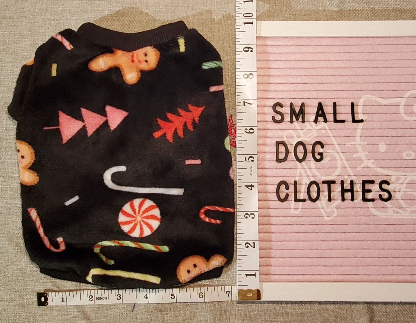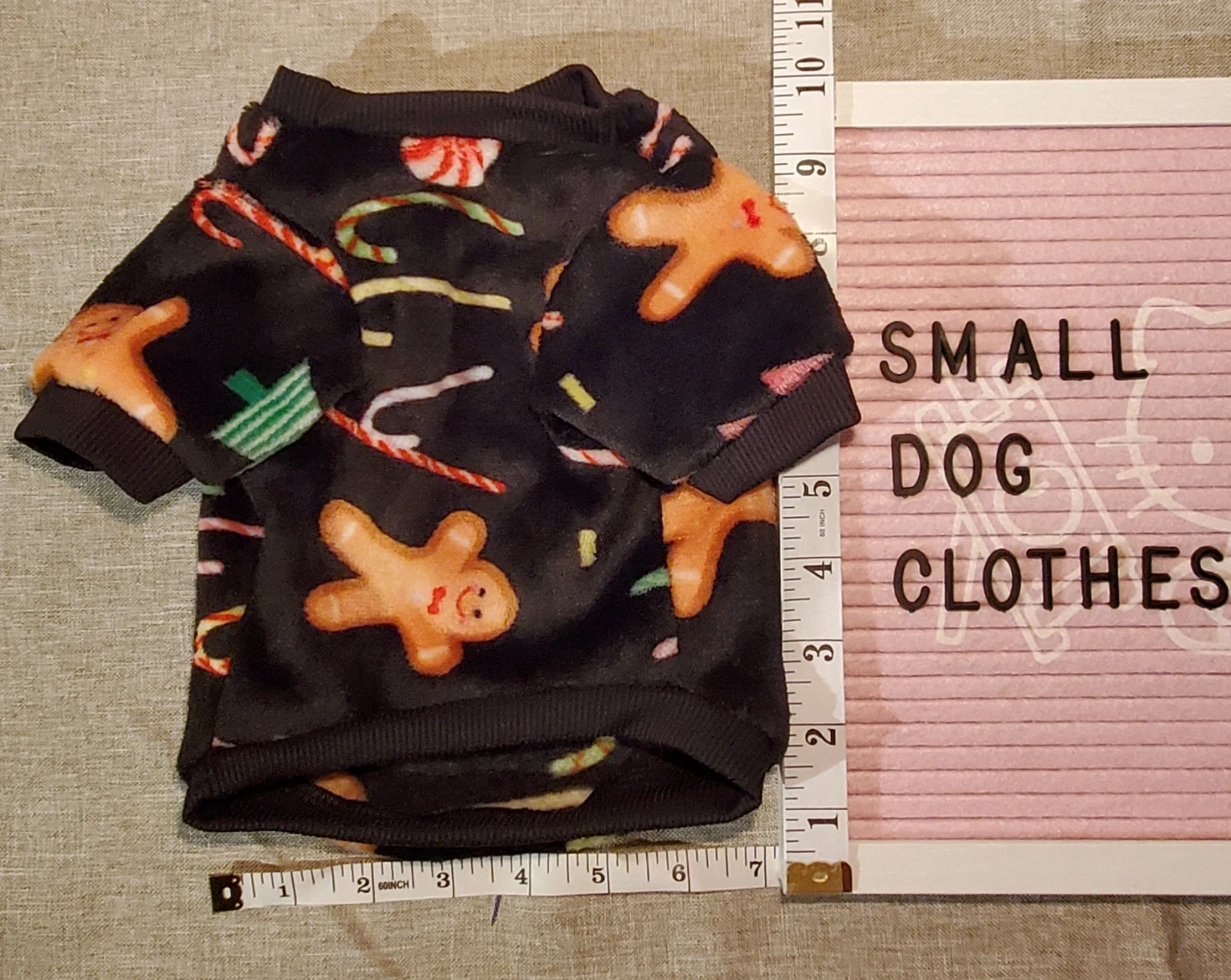 This cozy black fleece sweater is covered in a fun gingerbread man and candy cane print. It's designed for small dogs and features ribbed cuffs and hem for a snug fit. Keep your furry friend warm and festive!