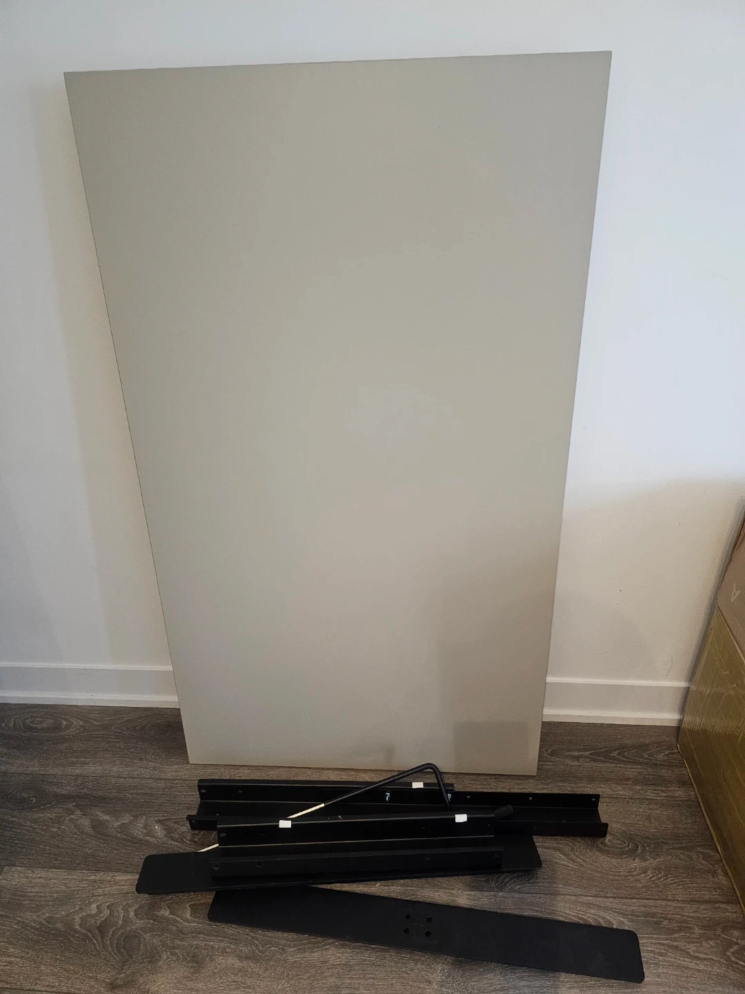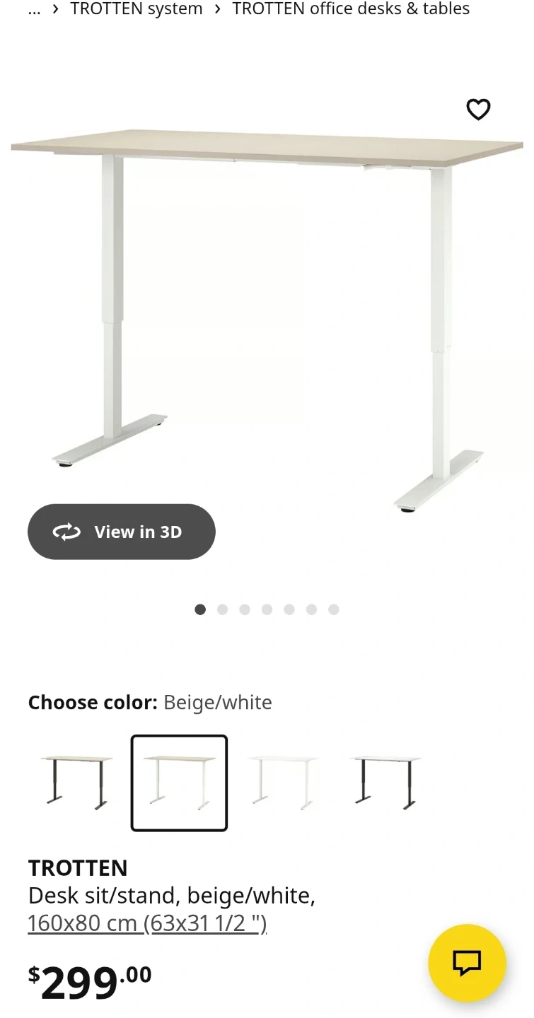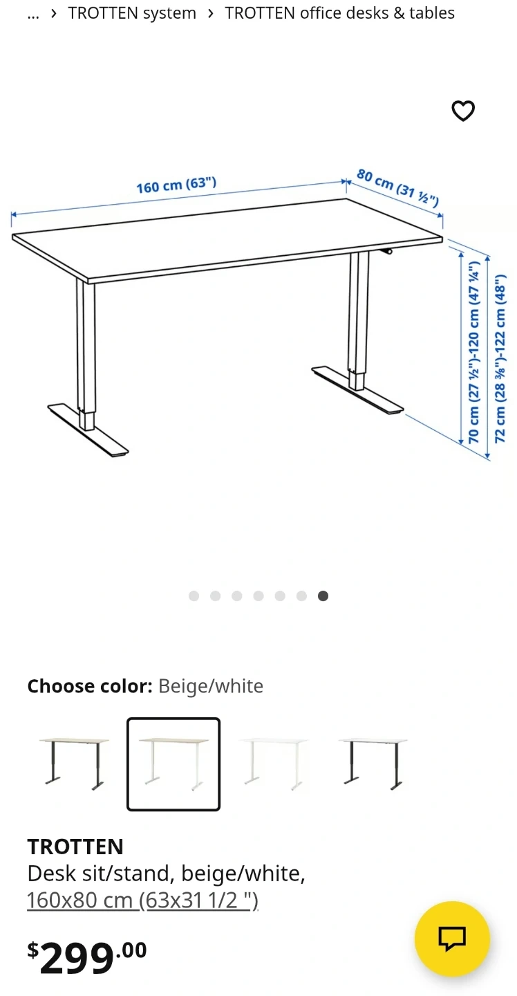 This IKEA TROTTEN desk lets you switch between sitting and standing throughout your workday. It's a beige/white sit/stand desk with a 160x80 cm tabletop.