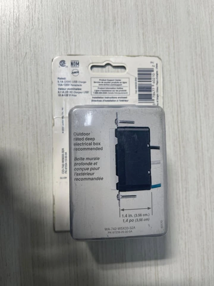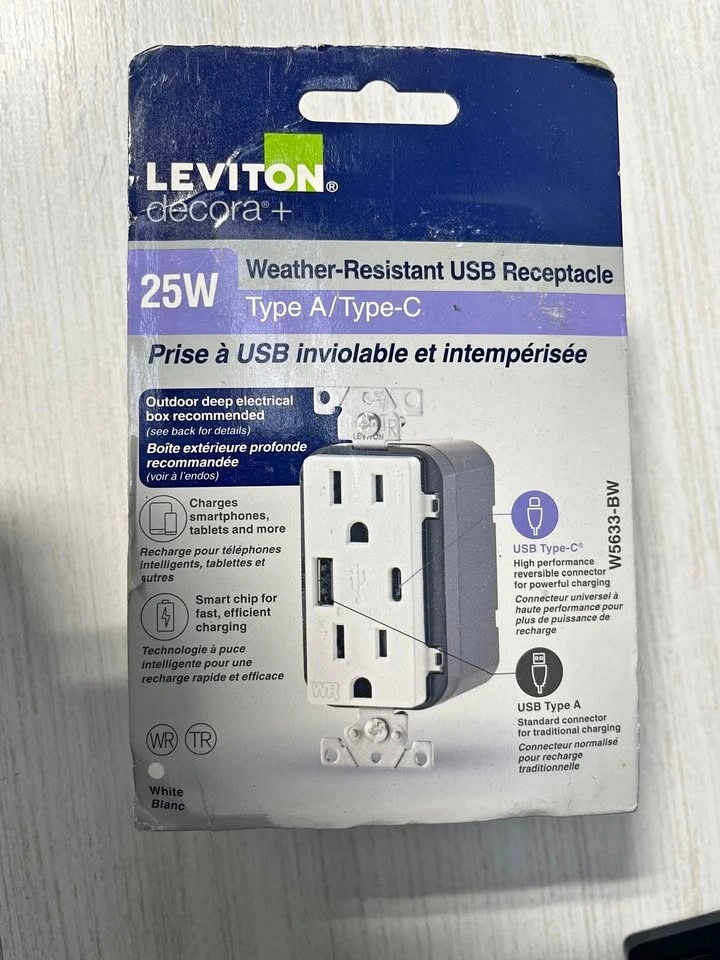 Brand new in box. Model: W5633-BW. Retail price was $47.42. Selling for $35. Pickup is at the main intersection of Islington and Rexdale in Etobicoke. Cash only. This is the industry's first weather-resistant USB receptacle, offering enhanced protection for electrical components. It features two USB ports providing a combined 5.1A charging current and over 25 watts of power. Ideal for outdoor residential and commercial areas like decks, patios, porches, and restaurants. The USB ports are durable, tested for over 10,000 insertions. Type-C port charges up to 3A @ 5V, and Type-A port charges up to 2.4A @ 5V. Wall plates are sold separately. Please call or message at [hidden information] if interested.