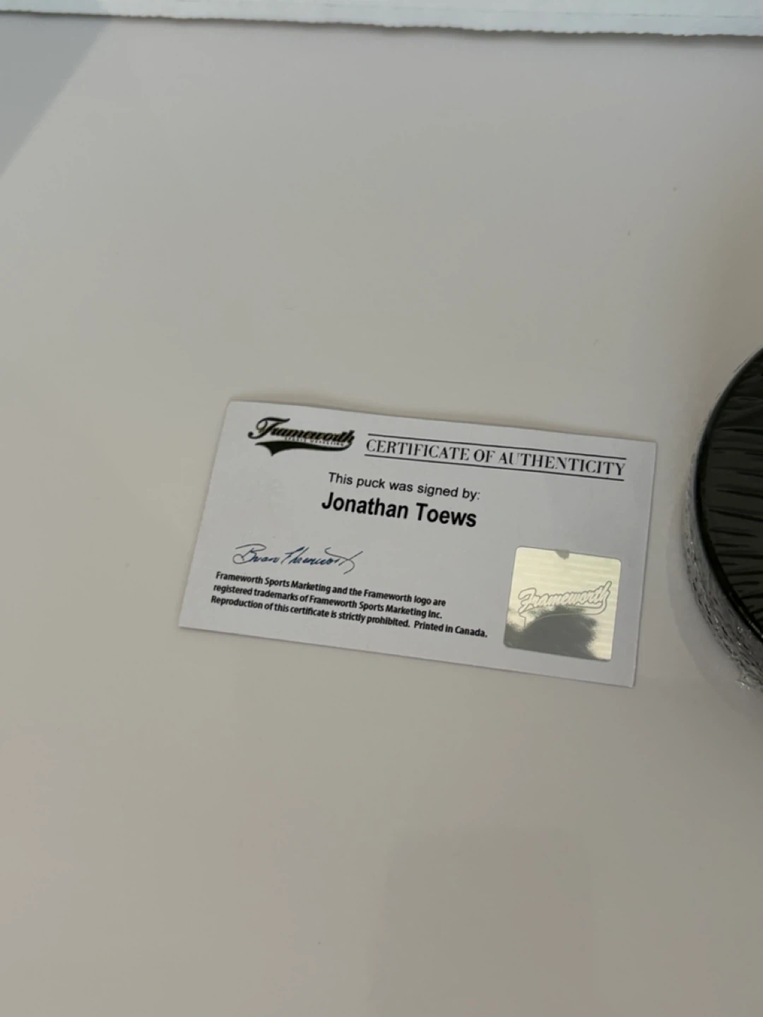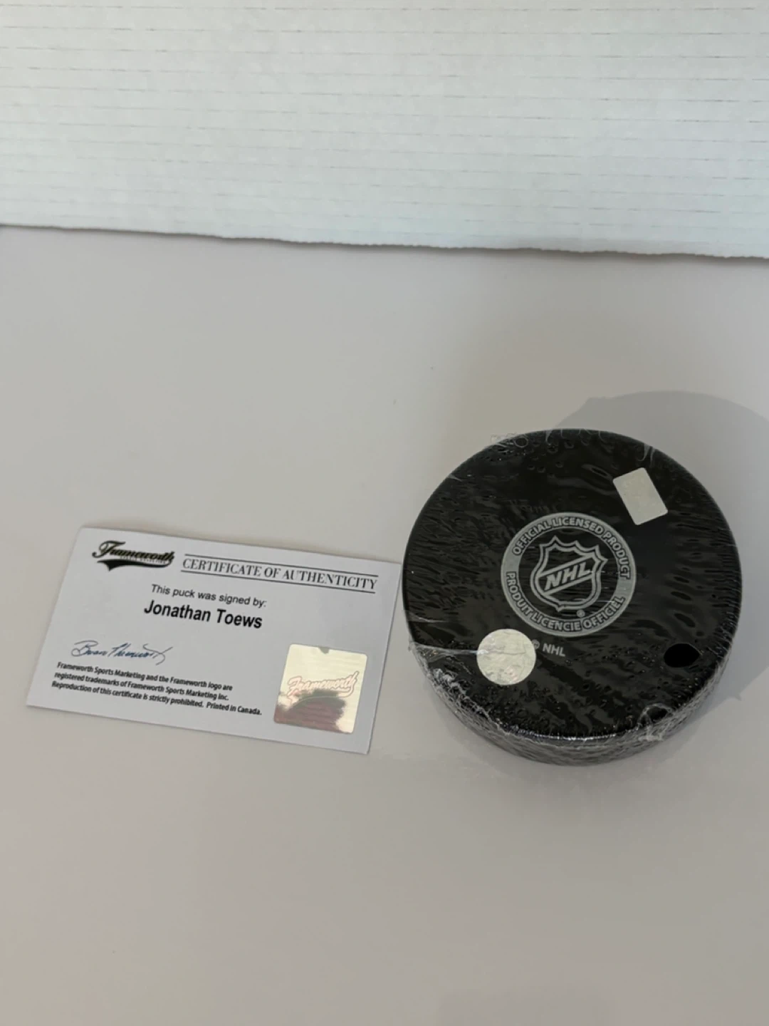 This puck was signed by Jonathan Toews. It includes a certificate of authenticity from Frameworth. Official NHL licensed product.