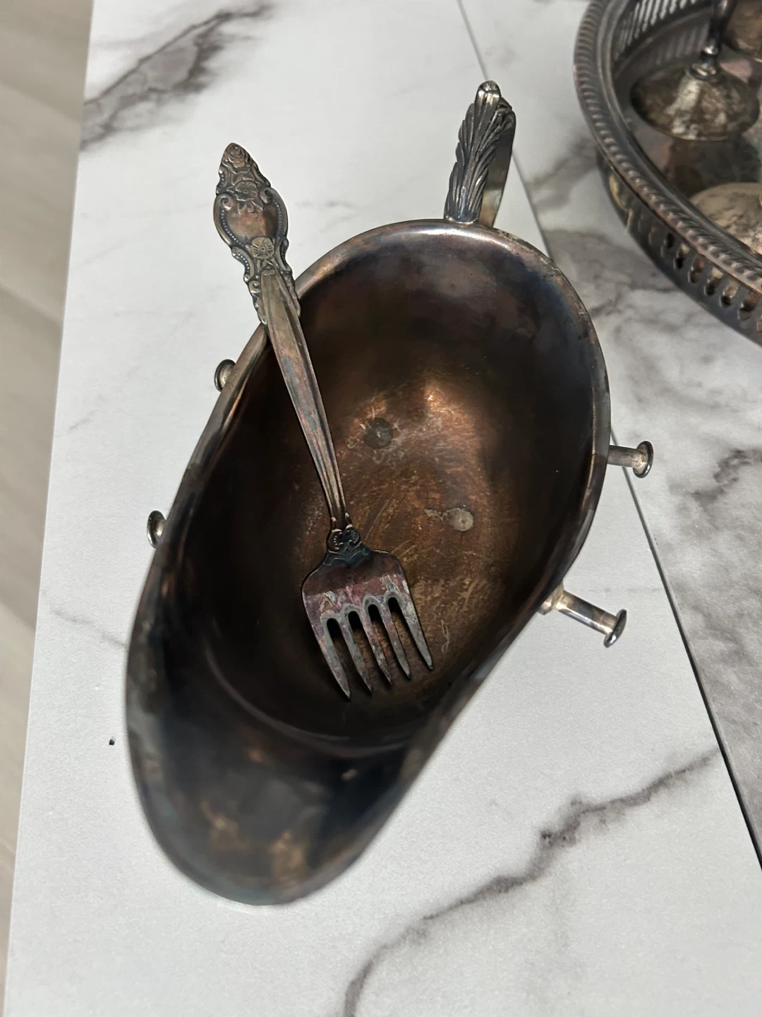 Vintage Silver-Plated Serving Dish with Fork and Goblets