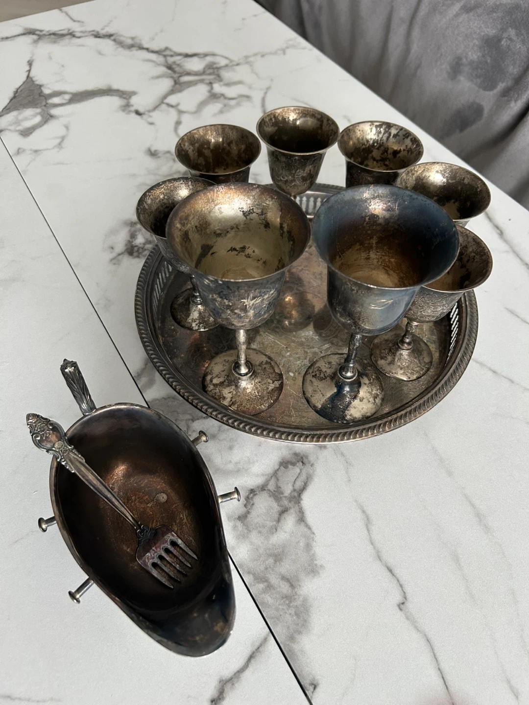 This set includes an ornate silver-plated serving dish with a matching fork, plus six silver-plated goblets on a decorative tray. It's a charming addition for serving drinks or small bites.