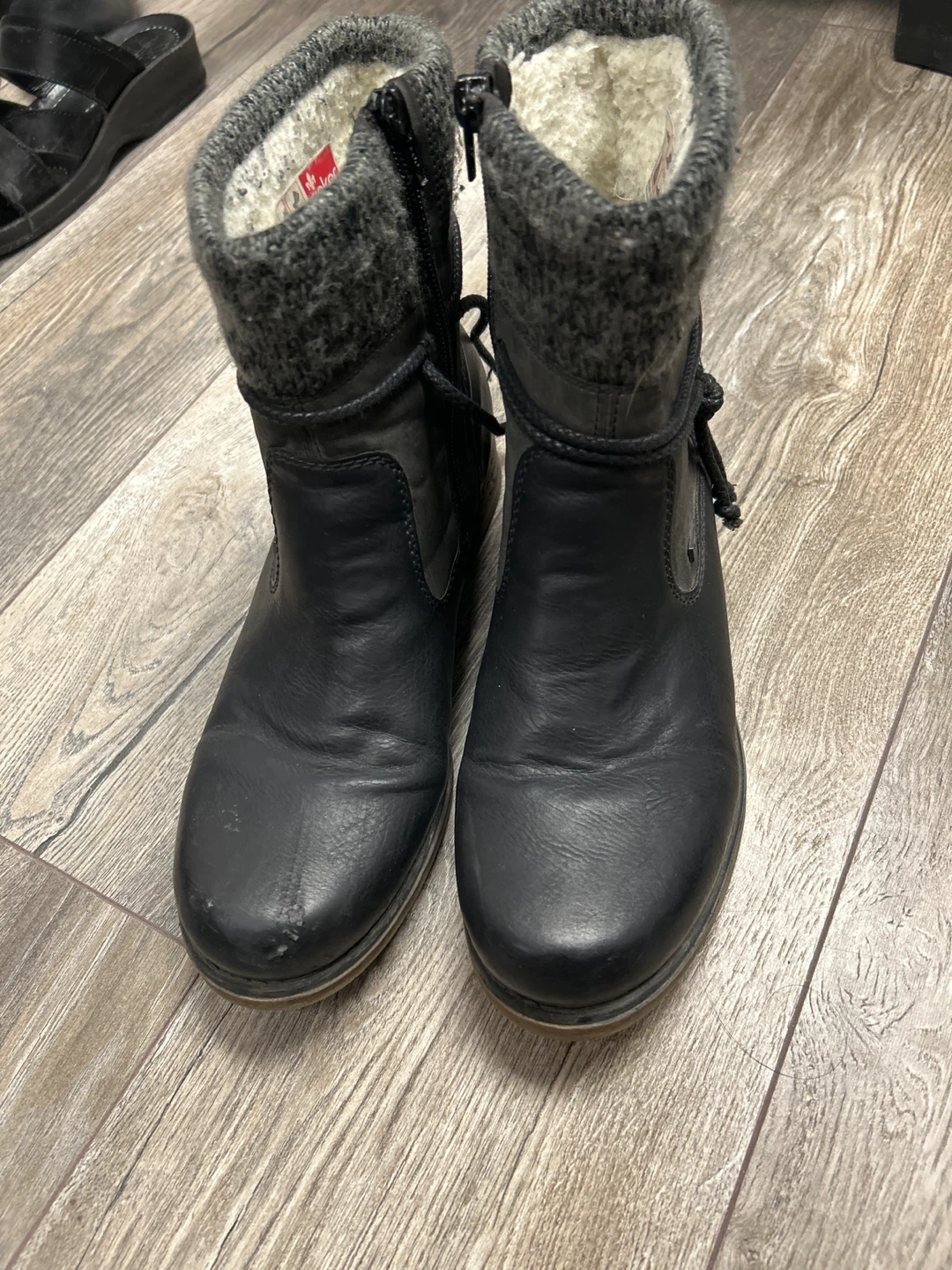 These Rieker boots are designed for warmth and comfort. They feature a durable black leather exterior with a cozy, insulated lining. The side zipper makes them easy to put on and take off.