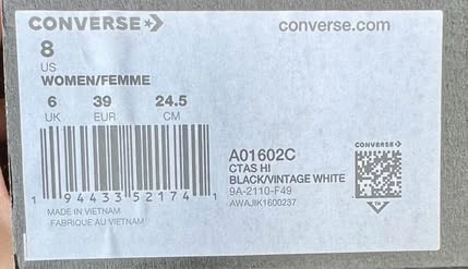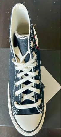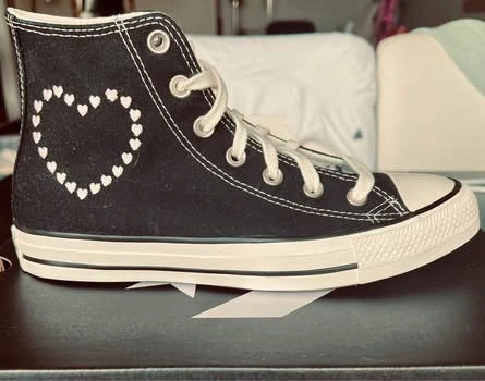 New Converse Chuck Taylor All Star High Top sneakers in a women's size 8. The classic black canvas is decorated with embroidered hearts. These shoes come in their original box and have never been worn.