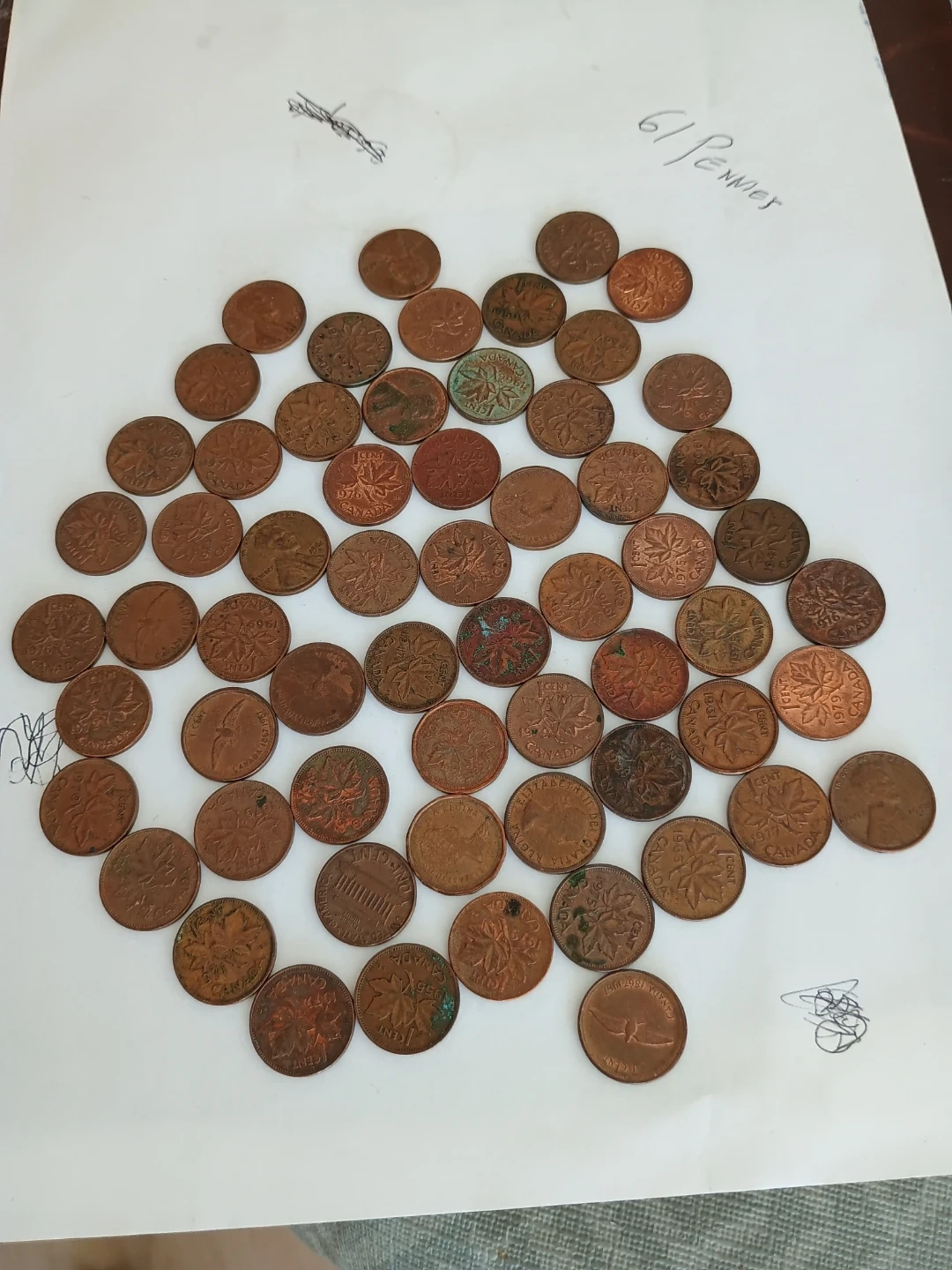 Collection of 61 Canadian pennies, varying in year. These coins are great for starting a collection or for educational purposes. They are copper-coloured.