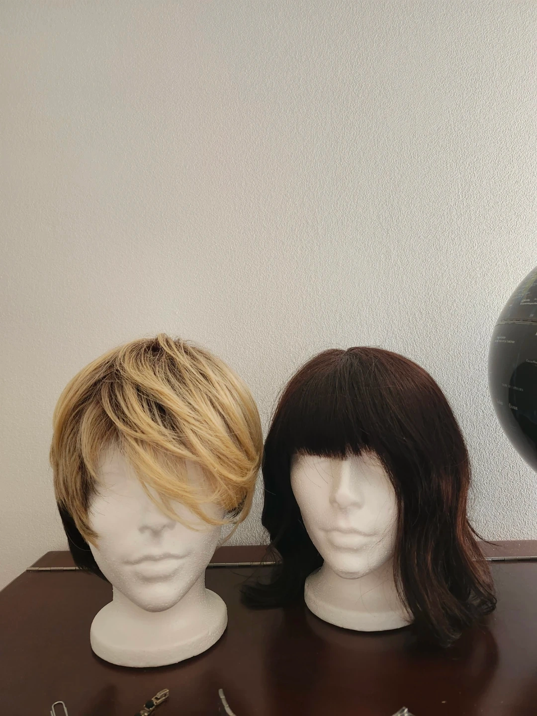This listing includes two wigs displayed on white mannequin heads. One wig is a two-tone blonde and black style, and the other is a dark brown wig with bangs. These wigs are ready for styling or display.