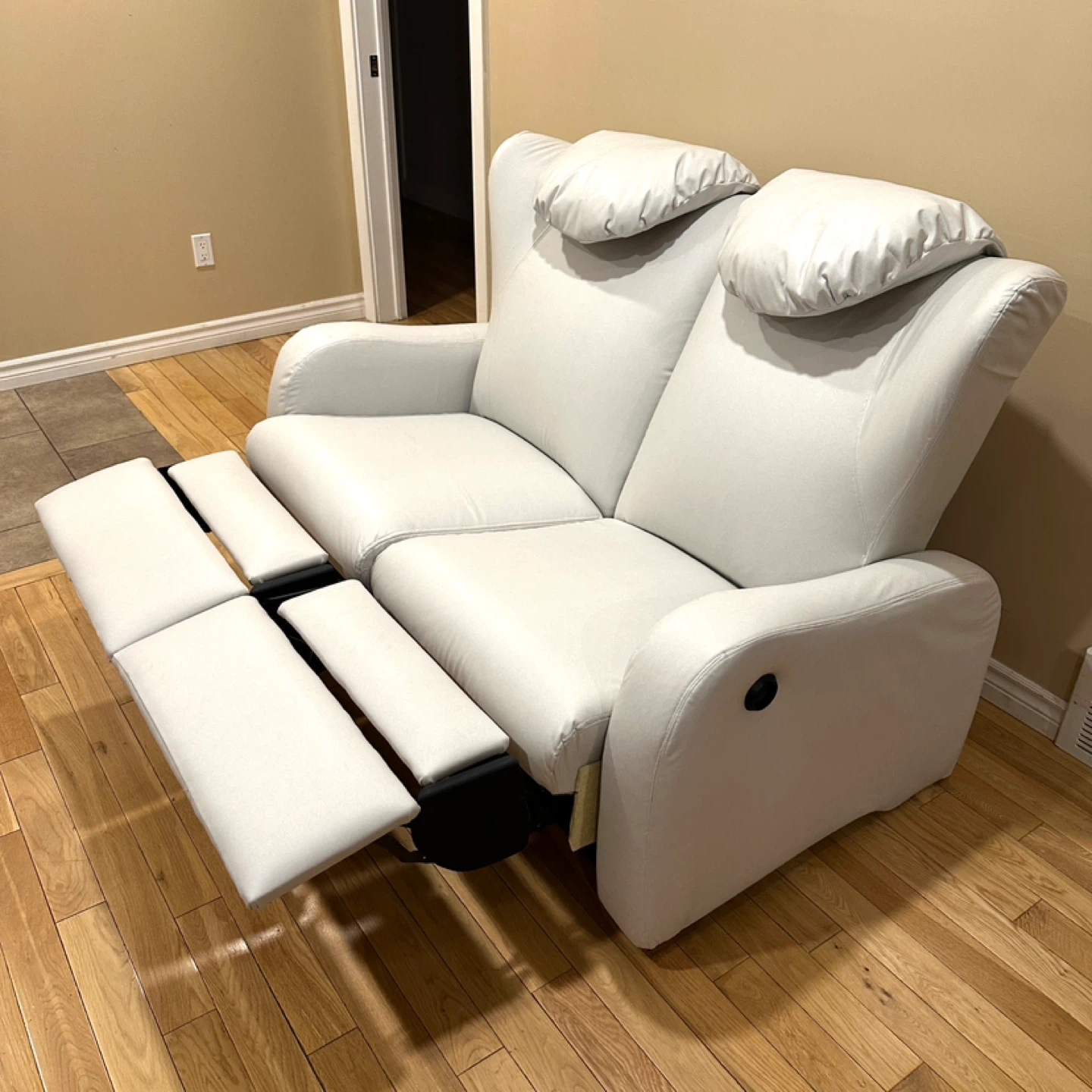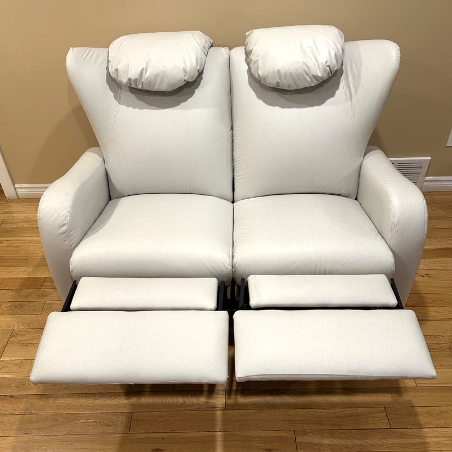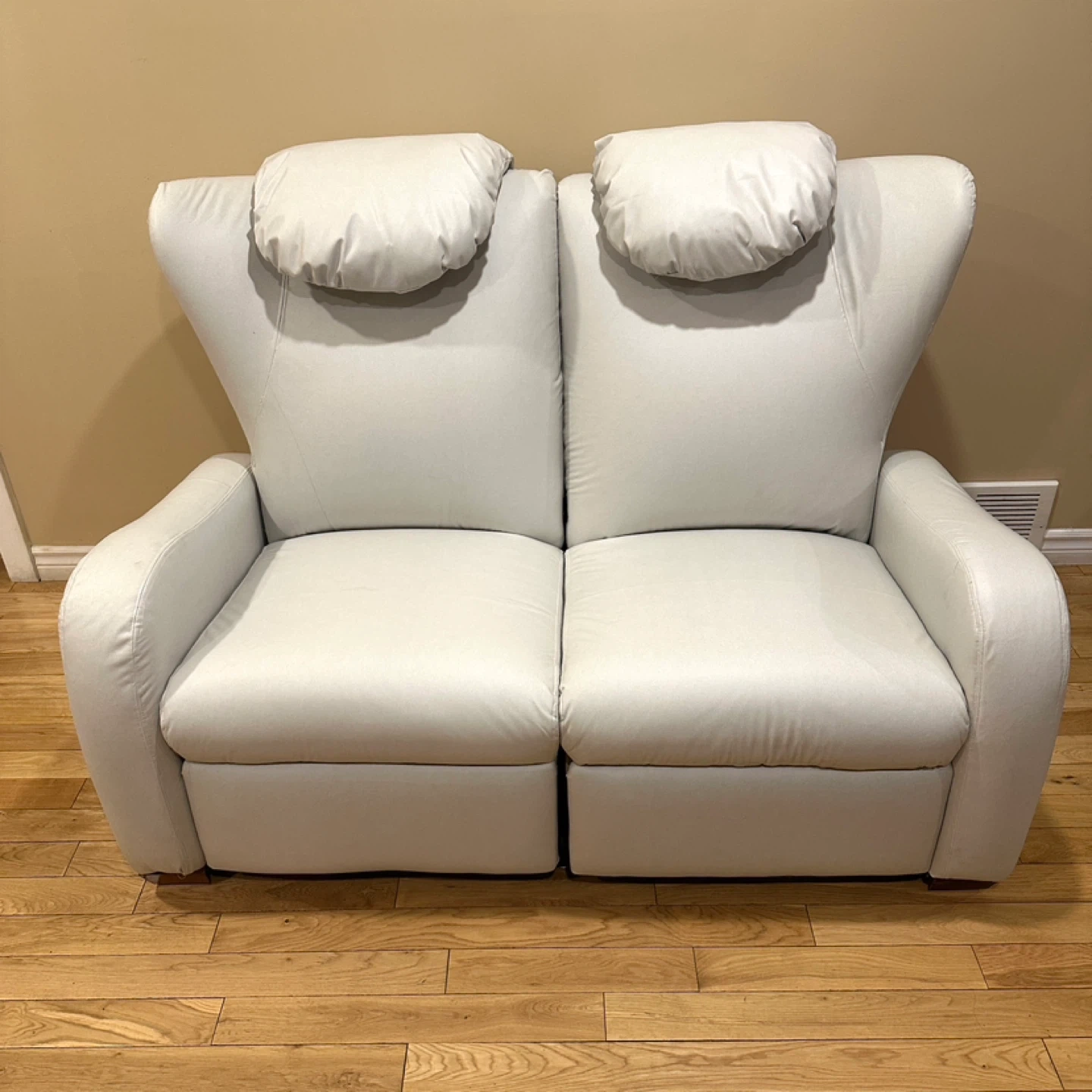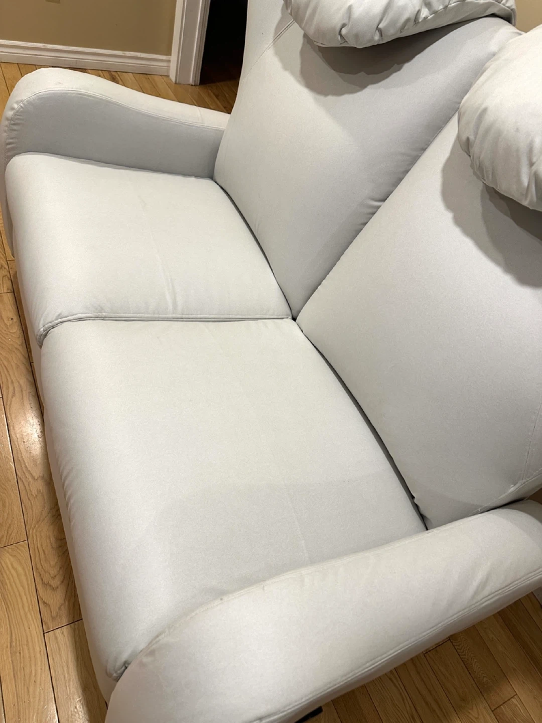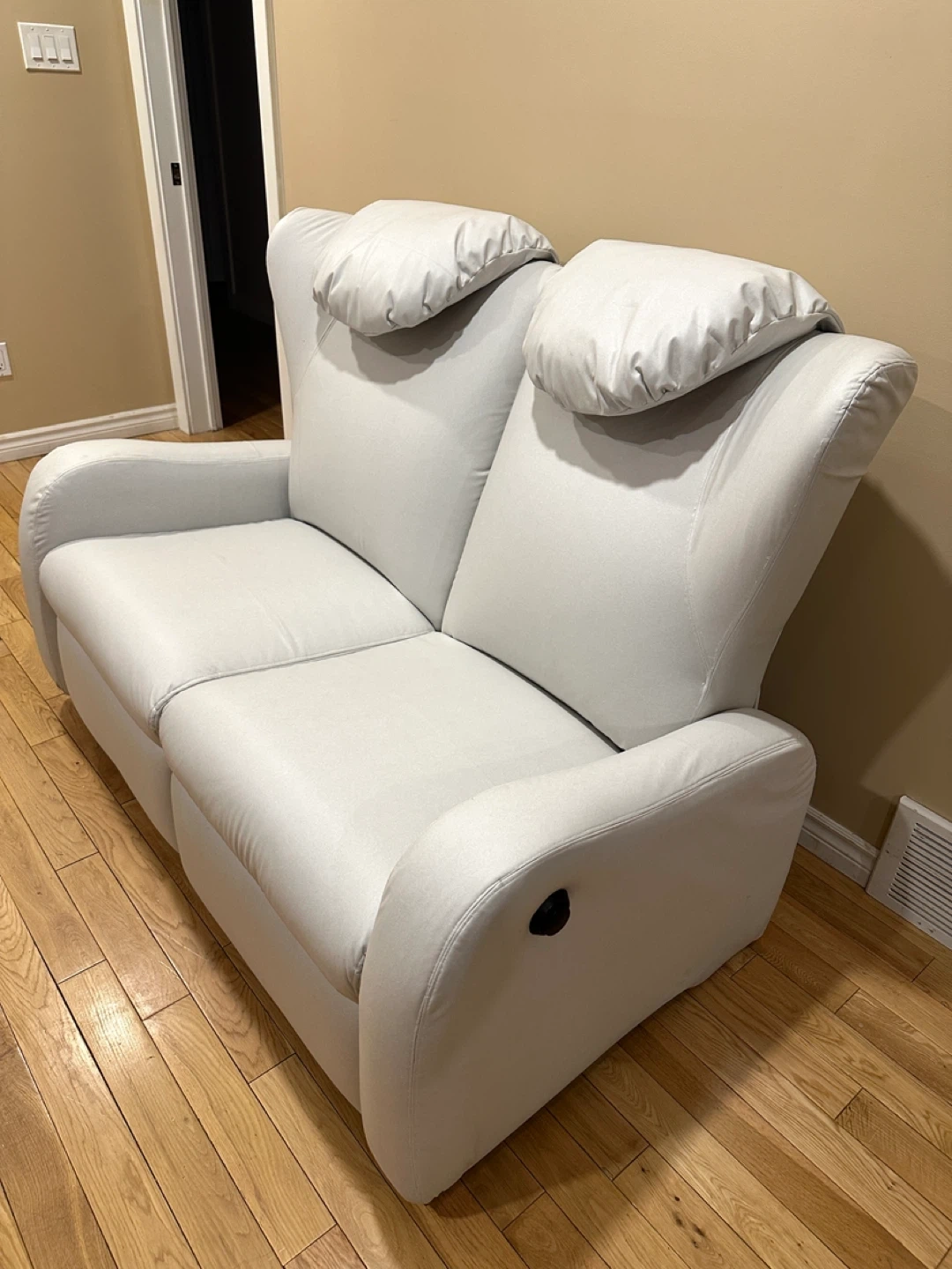 Comfortable and modern reclining loveseat in a soft light grey color. Both seats recline independently and work perfectly.