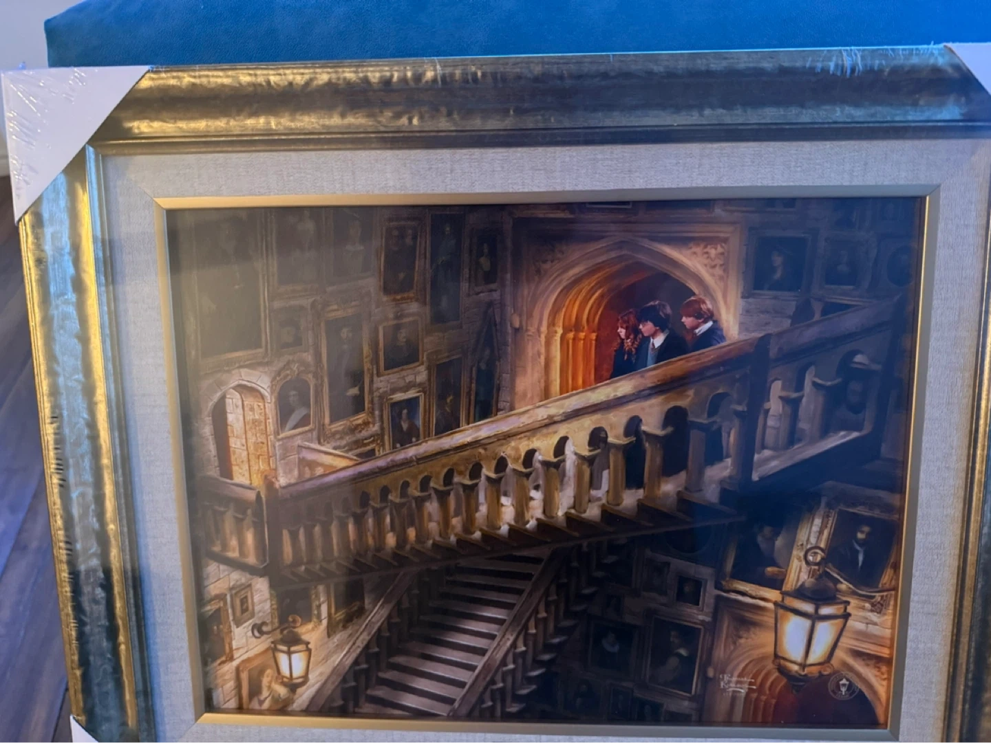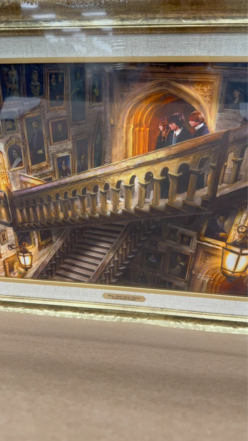 This framed art print depicts "The Moving Staircase" scene from Harry Potter. It's a detailed illustration of the iconic Hogwarts staircase. Ready to hang. By Thomas kinkade