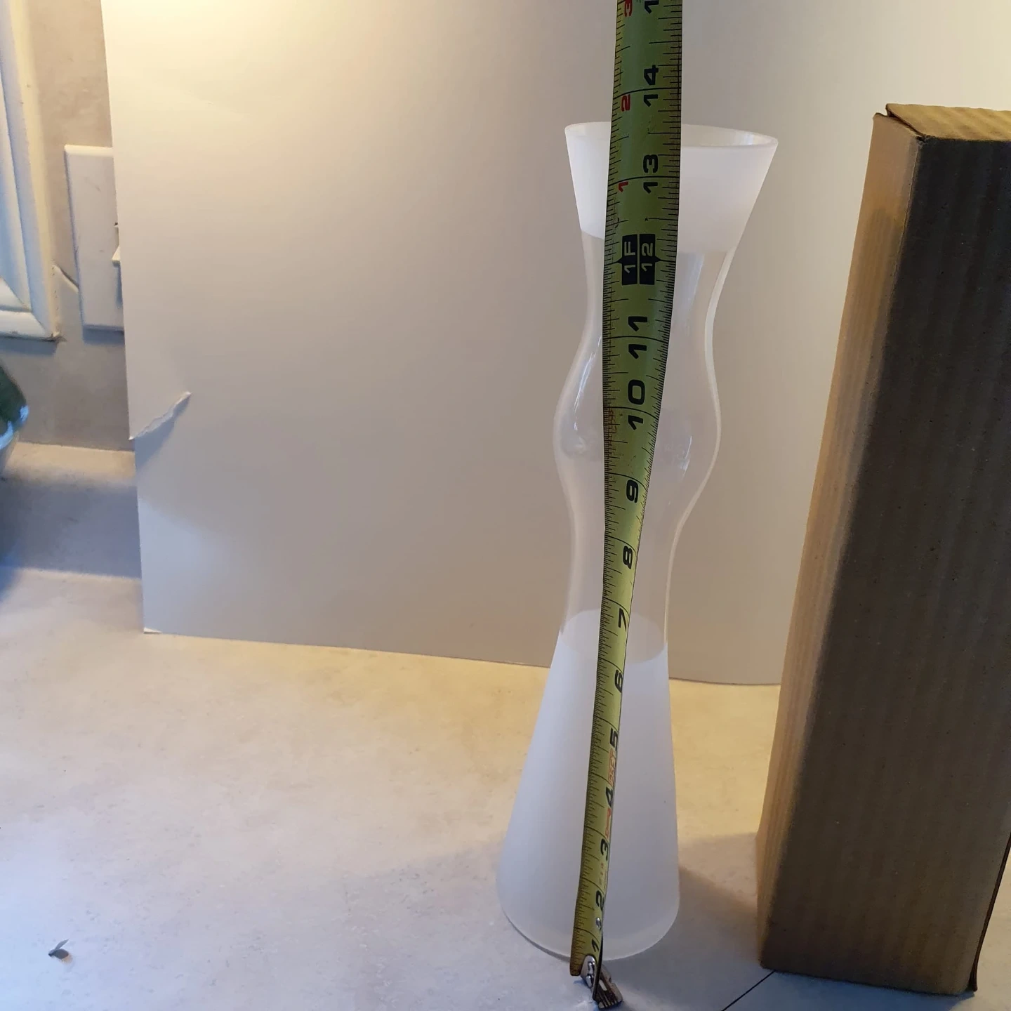 A tall, frosted glass vase with a unique hourglass shape. It stands about 14 inches tall. Comes with its original box.