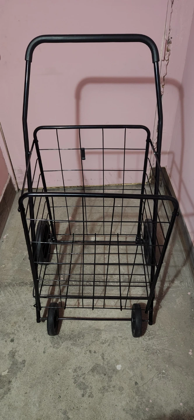 This black metal rolling shopping cart has a durable wire frame. It features a wide handle for easy pulling and two sturdy wheels. It's great for grocery trips or carrying laundry! It's perfect for anyone who needs help transporting items.cash only