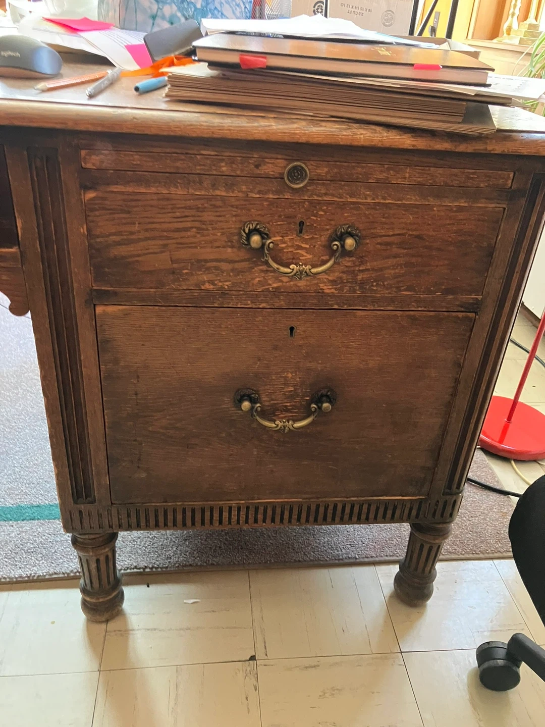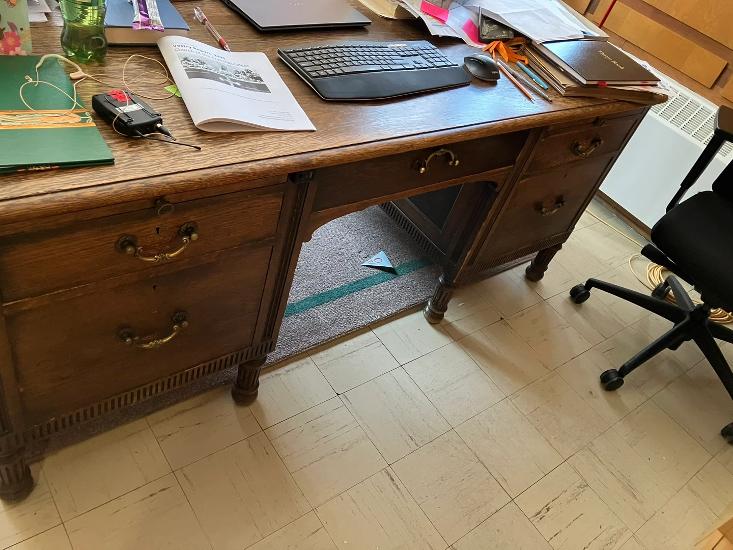 A solid oak antique partner’s desk. It features multiple drawers with ornate hardware. This desk offers ample workspace and storage.