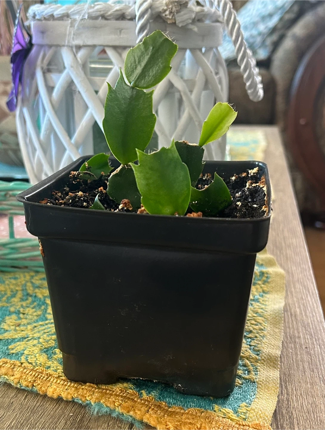 This is a Christmas cactus plant in a black pot. It's green and healthy, ready for a new home. These plants are known for their unique blooming season. They're a great addition to any indoor space!