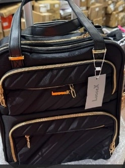 This LUGGEX underseat luggage measures 15.7x13.4x7.7 inches and fits most airline seats. The back sleeve attaches easily to larger luggage. It has a 28.8L capacity with 17 pockets, including a separate wet/dry pocket. The main compartment has X-shaped compression straps to keep things organized.