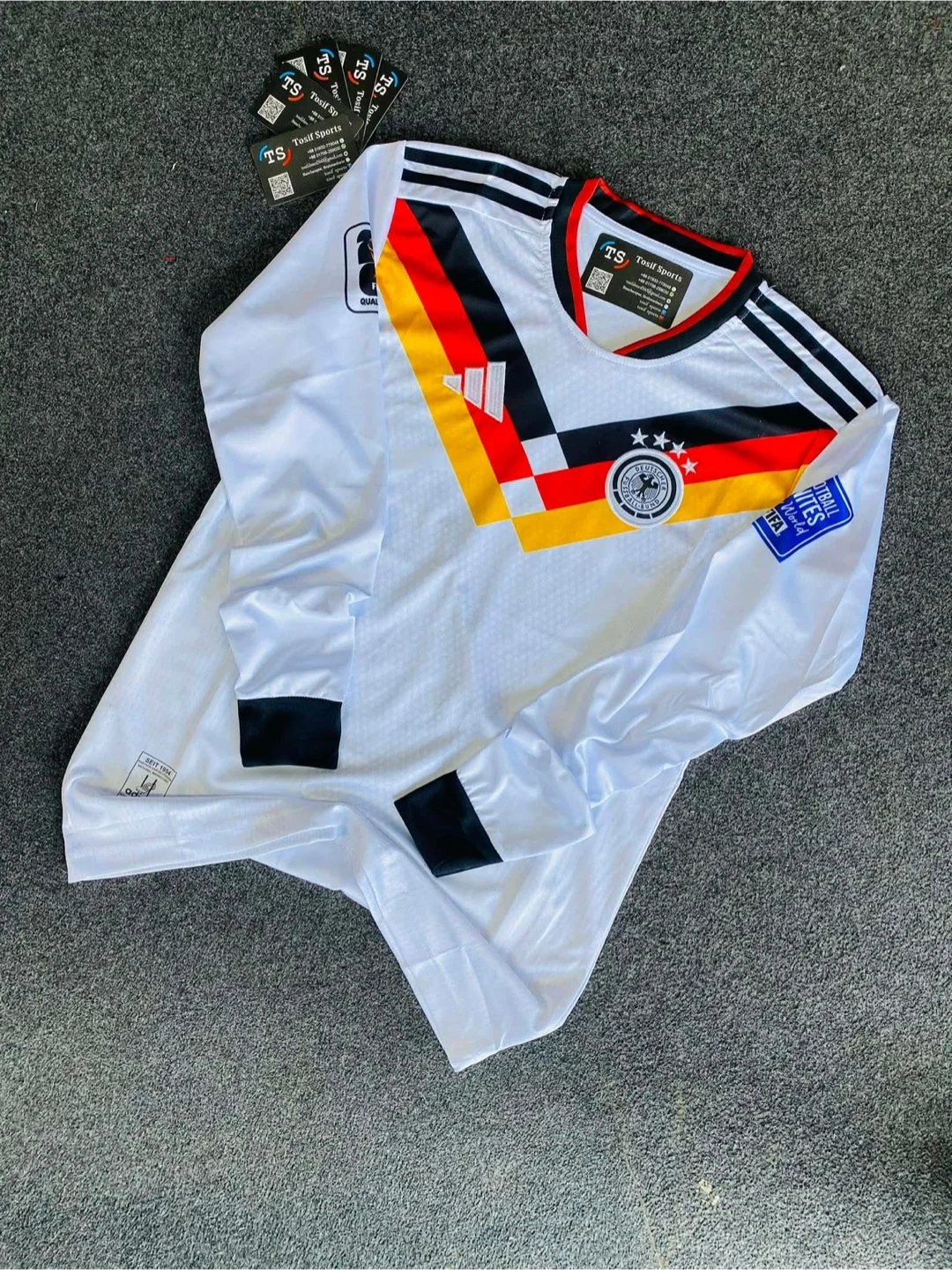 White long sleeve jersey with black, red, and gold trim. Features the German national team crest and Adidas stripes on the shoulders. Size is L. Made from breathable fabric.