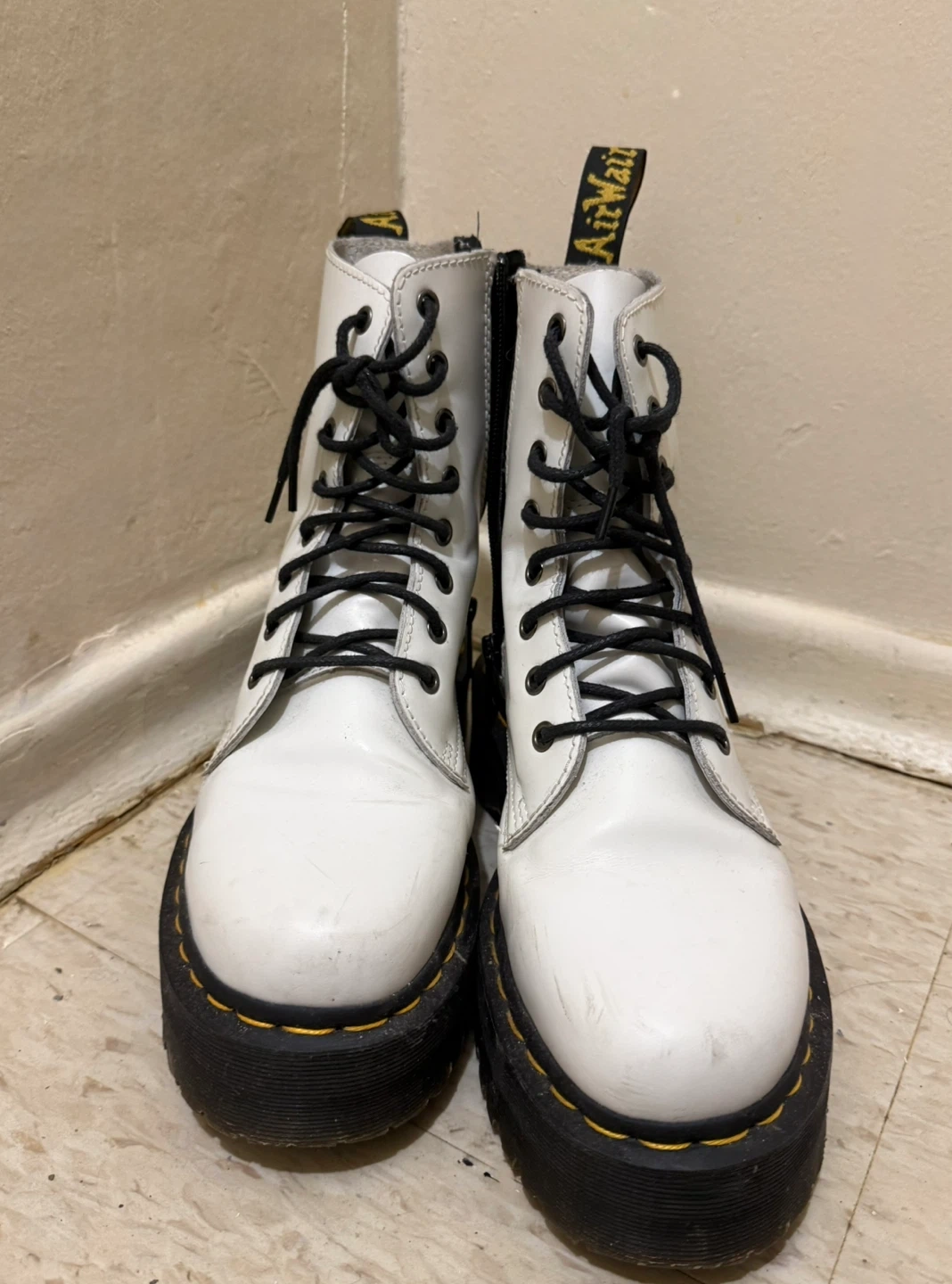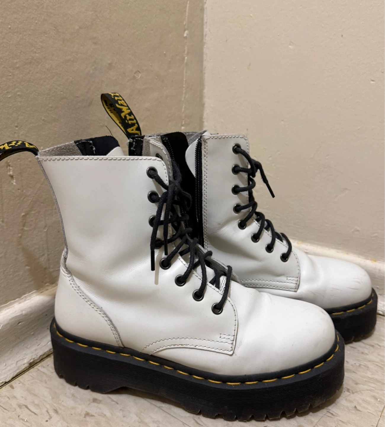 White leather Dr. Martens platform boots with black laces and a side zipper.