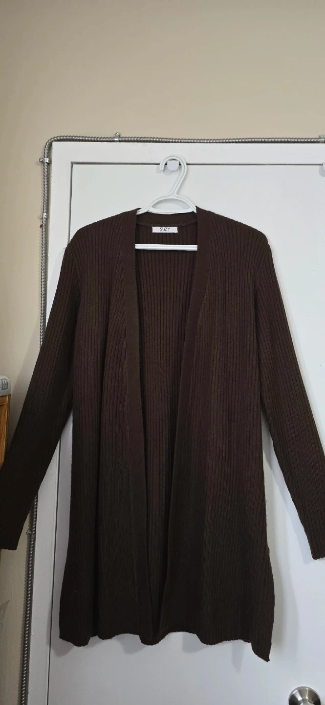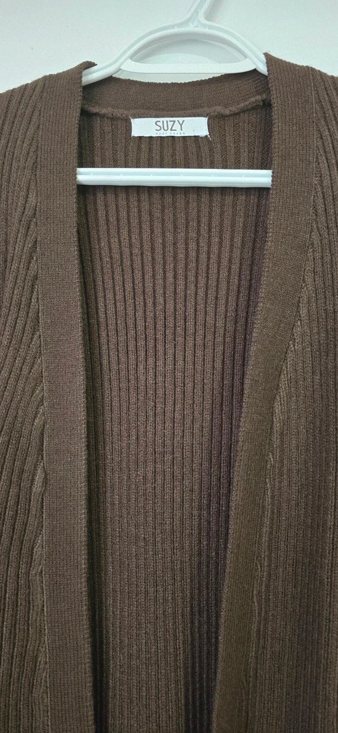 This is a brown open-front cardigan sweater by Suzy. It's a ribbed knit design. The long sleeves and mid-length cut make it a versatile layering piece.