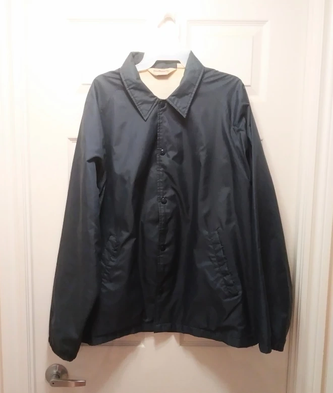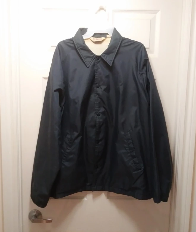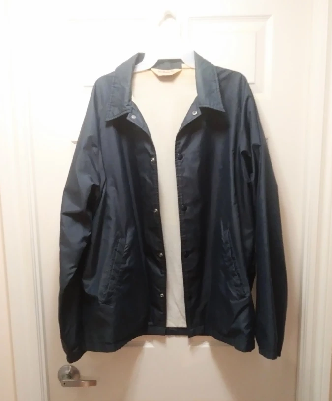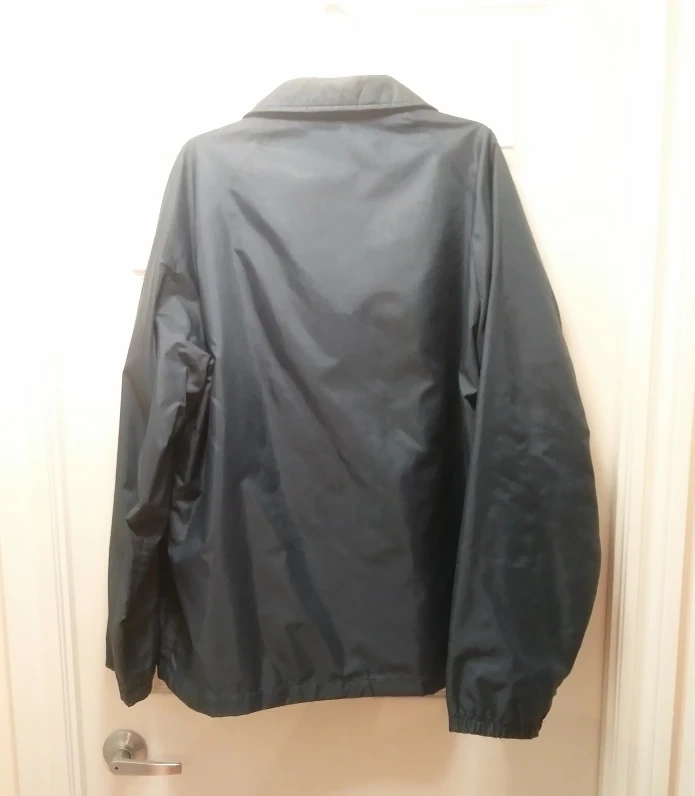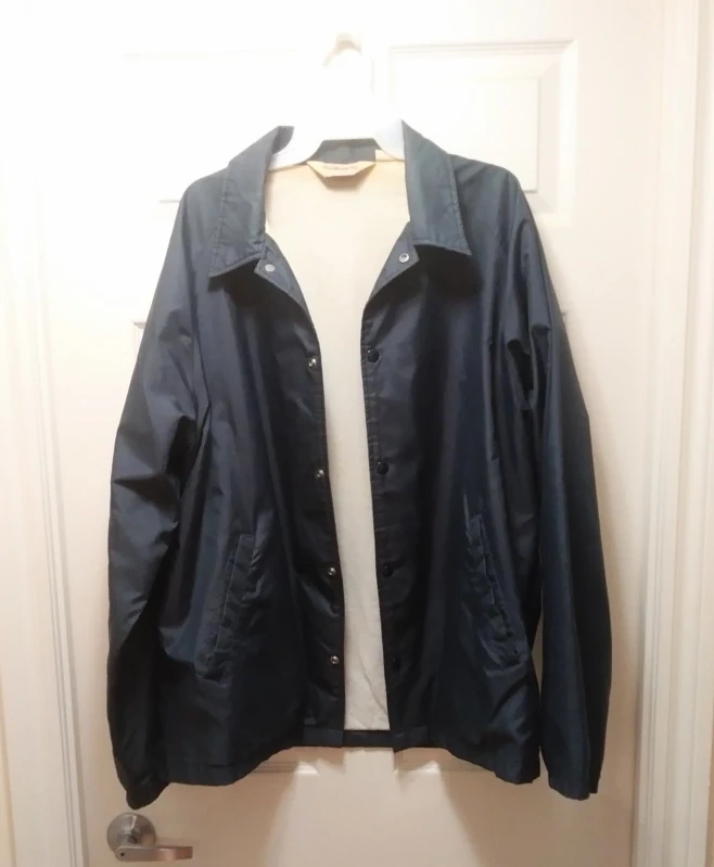 A lightly used men's jacket for spring and fall. The dark blue nylon/polyester jacket has a cotton lining. This lightweight jacket has long sleeves, with a buttoned up front and 2 pockets. It does not have a hood.