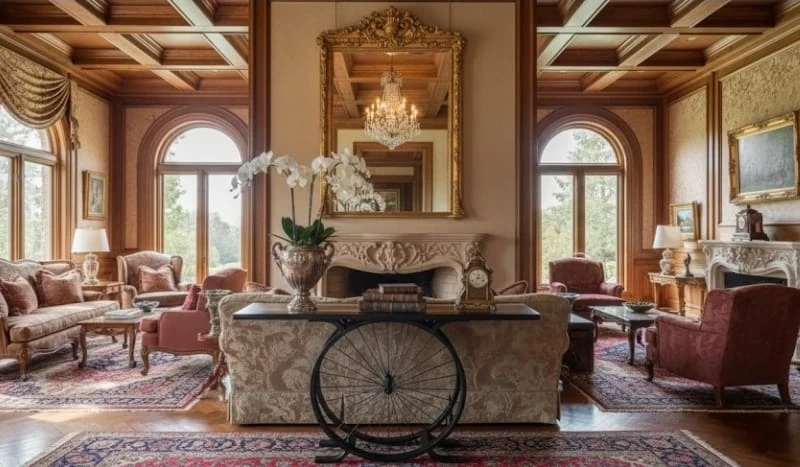 Wood and Epoxy Console Table with Bicycle Wheel Base
