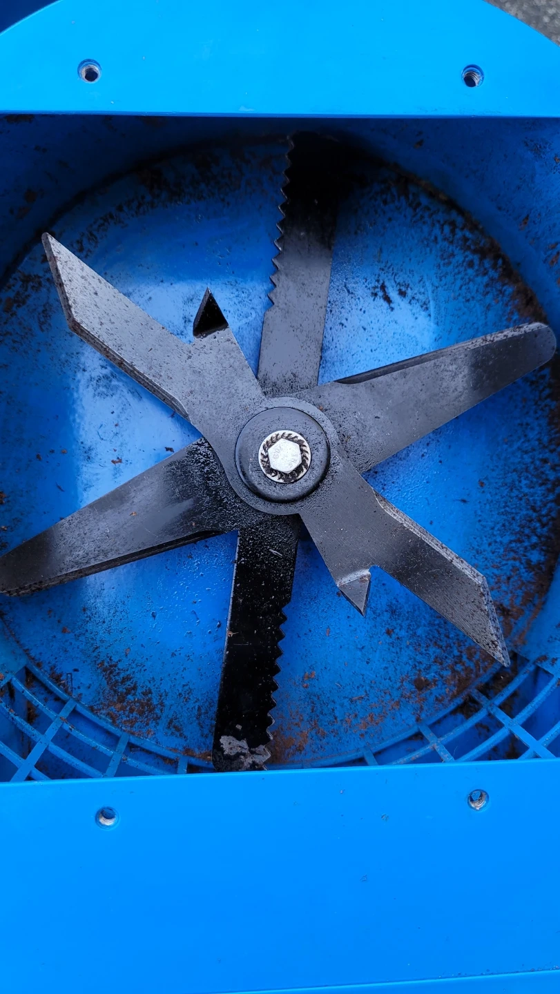 This Landworks leaf mulcher shredder is electric and comes in a bright blue colour. It has a 11" cutting blade and a .5" cutting capacity for leaves, grass, and clippings. The shredder is mounted on wheels for easy transport.