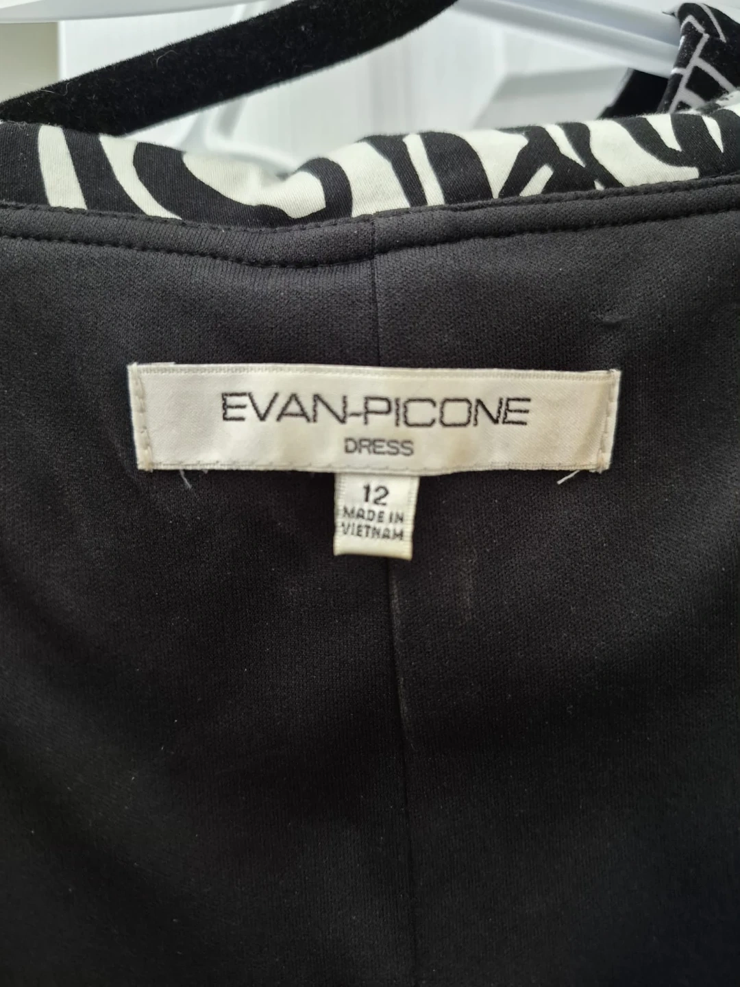 This sleeveless dress features a striking black and white floral pattern. It's a size 12, made in Vietnam.