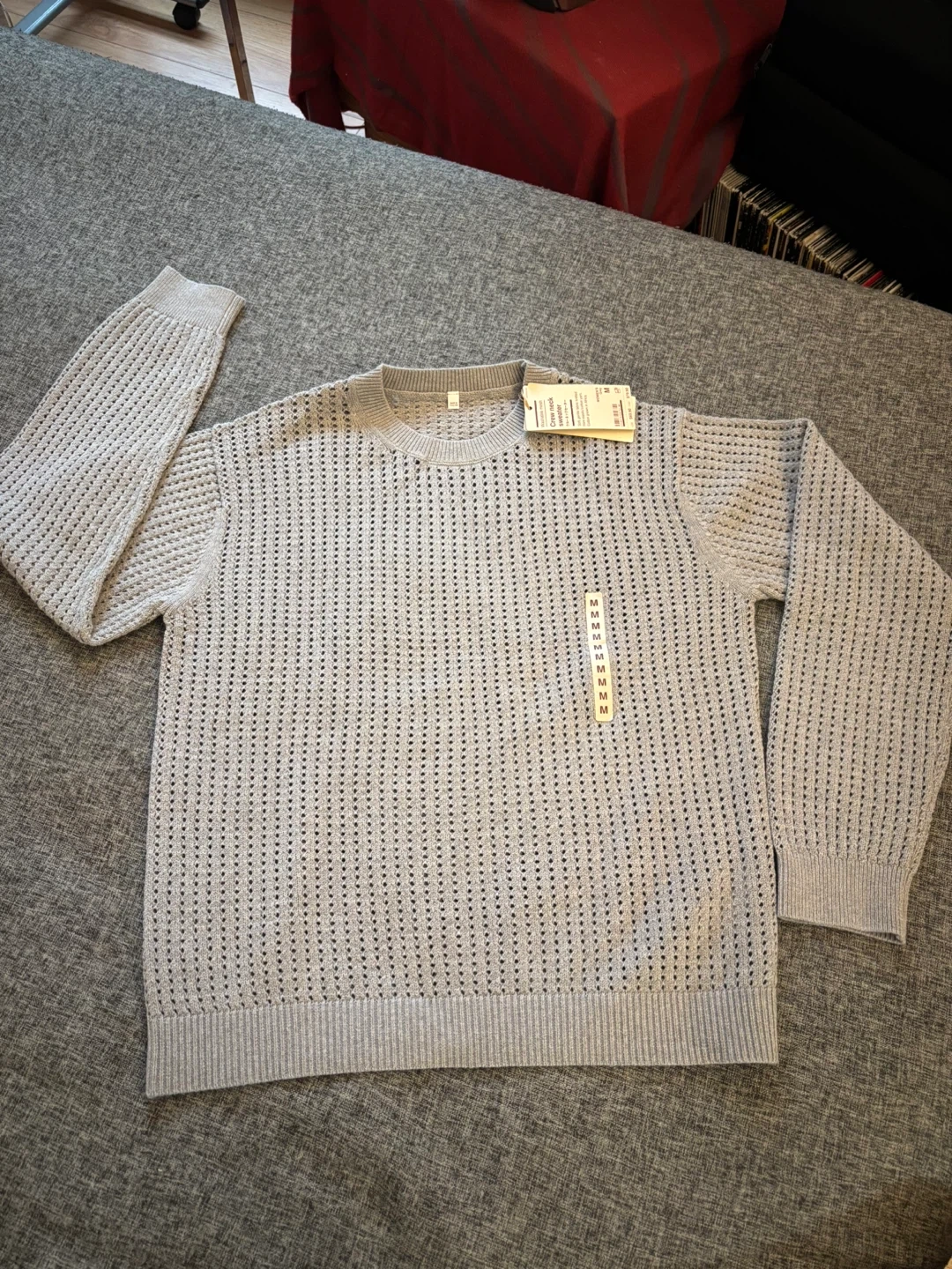 This is a MUJI washable mesh crew neck sweater. It's made from elastic/cotton yarn knitted with a soft, gentle fabric. The cotton is grown in Africa. It's a great option for warmer weather or layering!