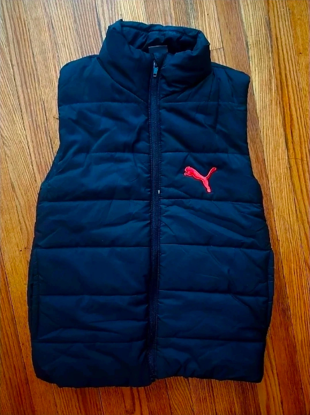 This is a black puffer vest from Puma. It's sleeveless and has a full zip front closure. The vest is quilted for warmth and features the Puma logo on the chest. For age 6 aproximately 🥕