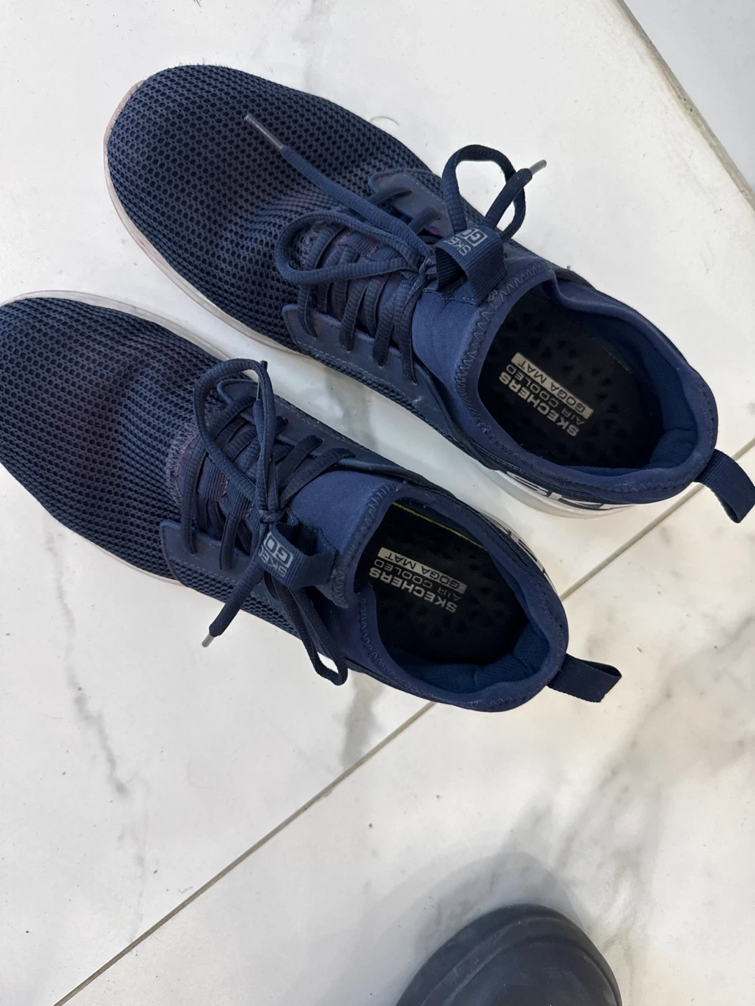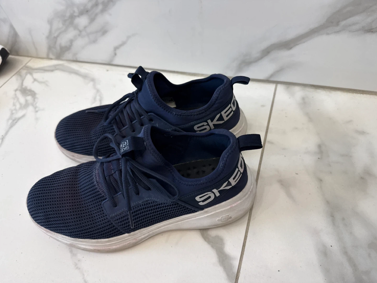 These Skechers GOwalk sneakers are a navy blue colour with a breathable mesh upper. They feature a comfortable sole and lace-up closure. This pair is suitable for everyday wear and light activity.
