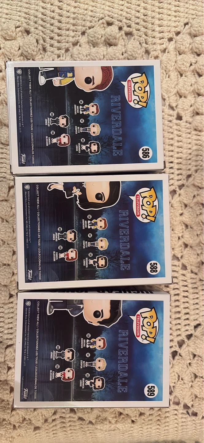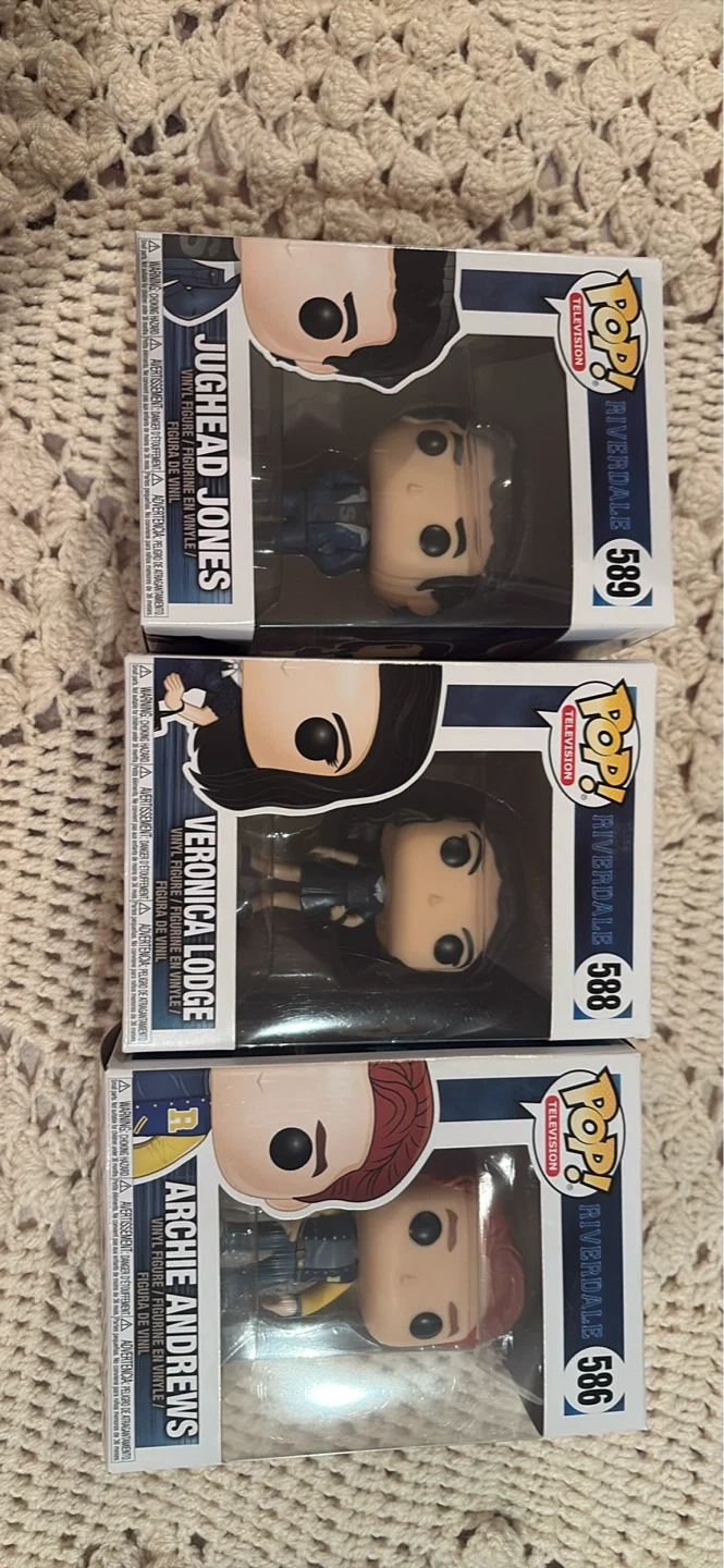 Entire Riverdale Funko, Pop collection figures. Includes Archie Andrews, Betty Cooper, Cheryl Blossom, Jughead Jones, and Veronica Lodge. These vinyl figures come in their original boxes.