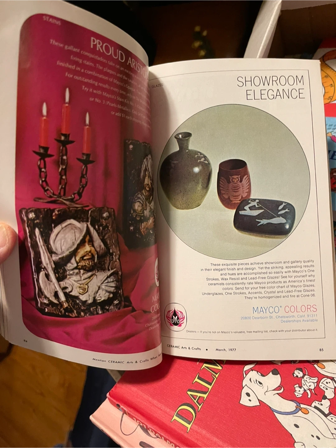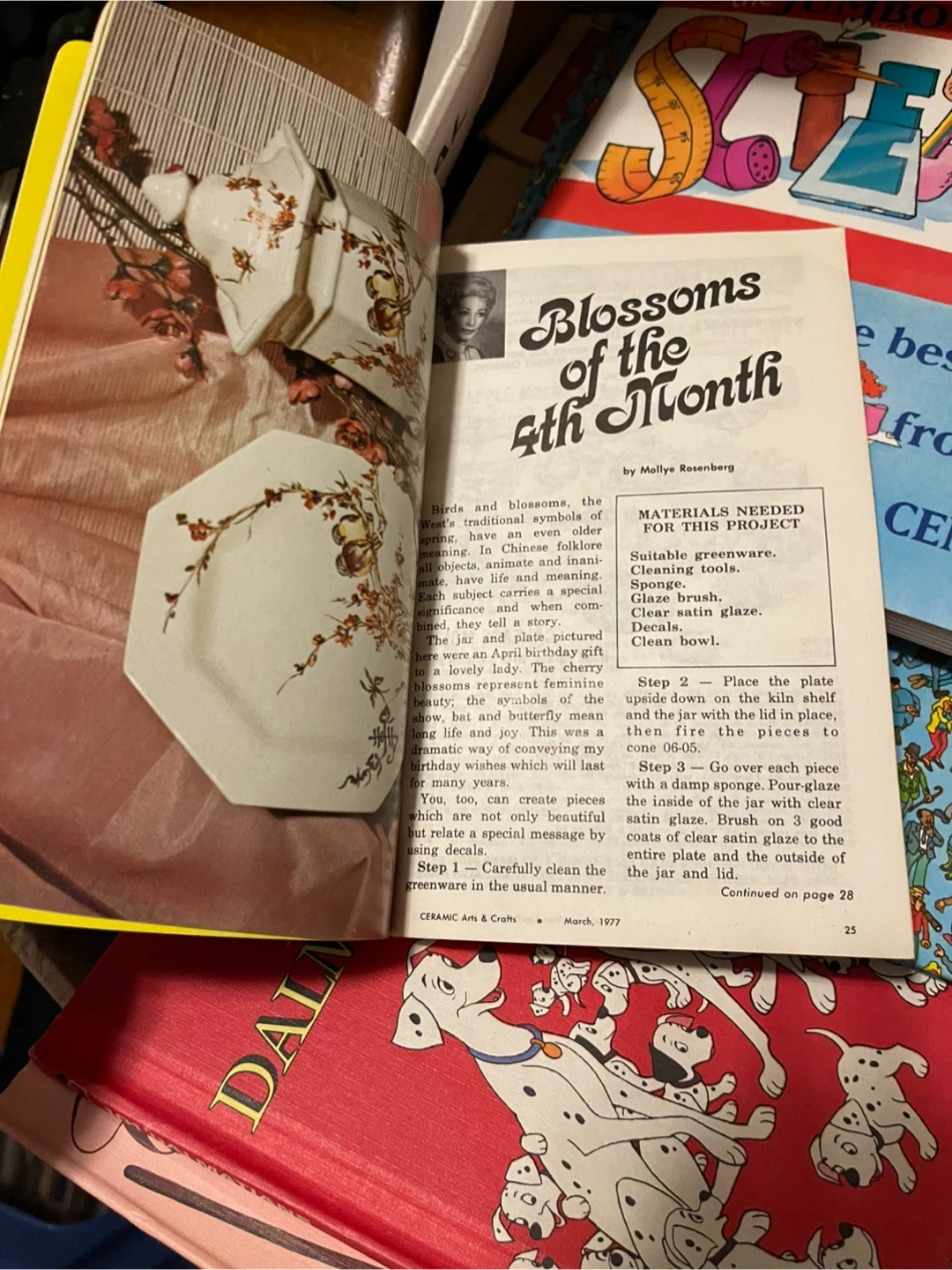 This issue of Ceramic Arts & Crafts magazine is from March 1977. It features articles on "Blossoms of the 4th Month" pottery and "Proud Aristo" ceramic pieces. It also includes a special pattern section.
